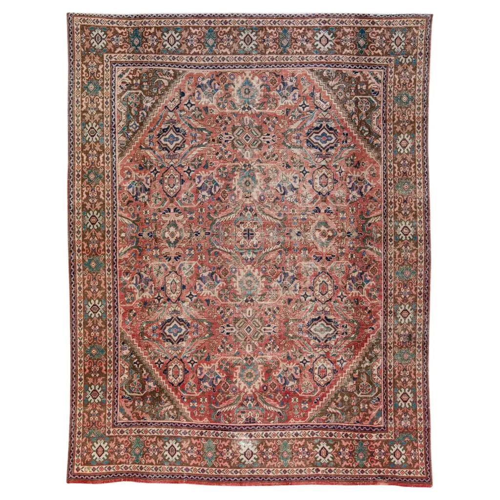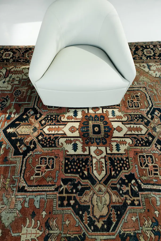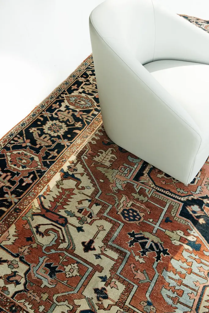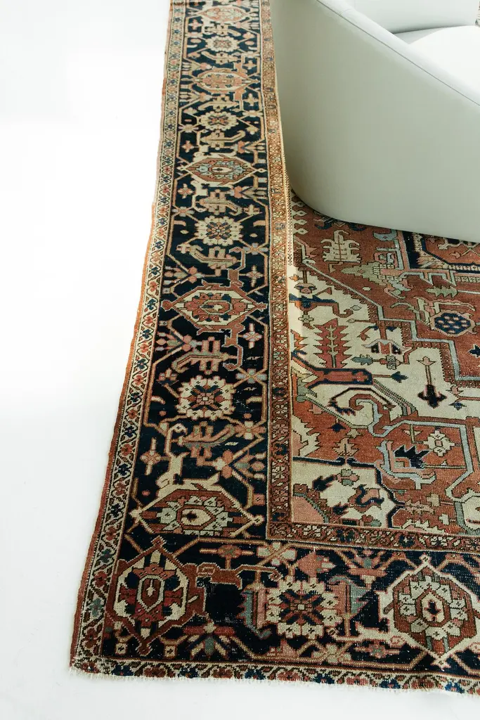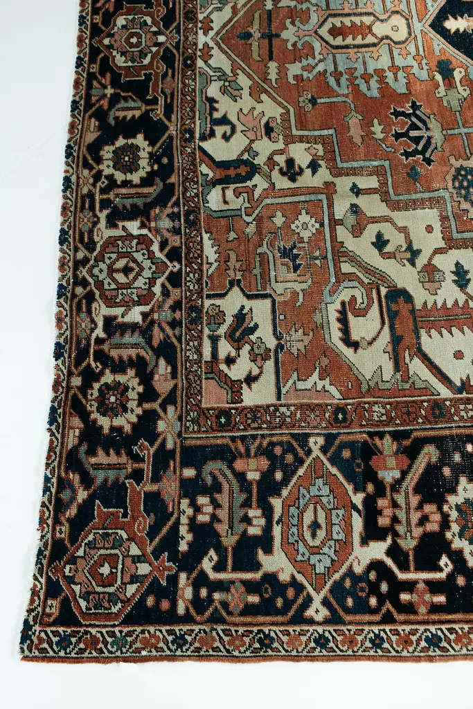 This antique Persian Serapi is a distinct Heriz region style, woven in the mountains of Northwest Persia. Borrowing design elements from many traditions. Rich contrasting colors are evenly distributed and hand woven of luscious natural wool. Rug number: 26027Size: 9' 6" x 11' 10"Design reference: SerapiCollection: Antique/VintageMaterial: WoolTexture: Pile weaveOrigin: Iran, Persia.
