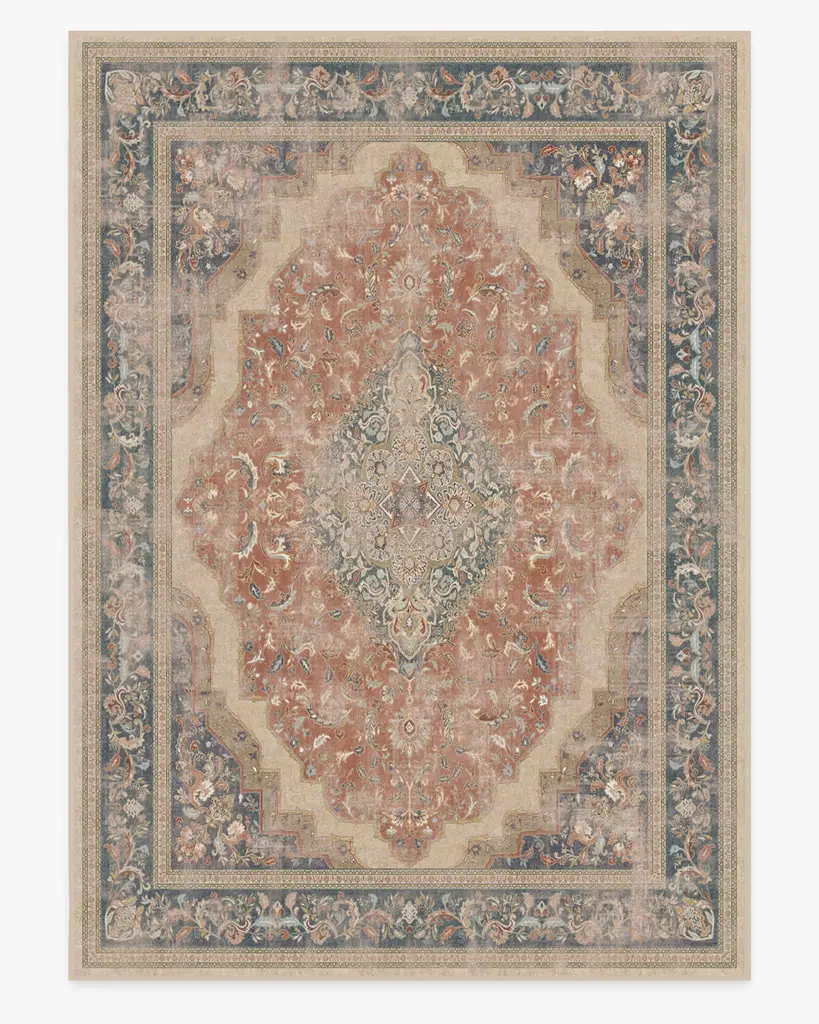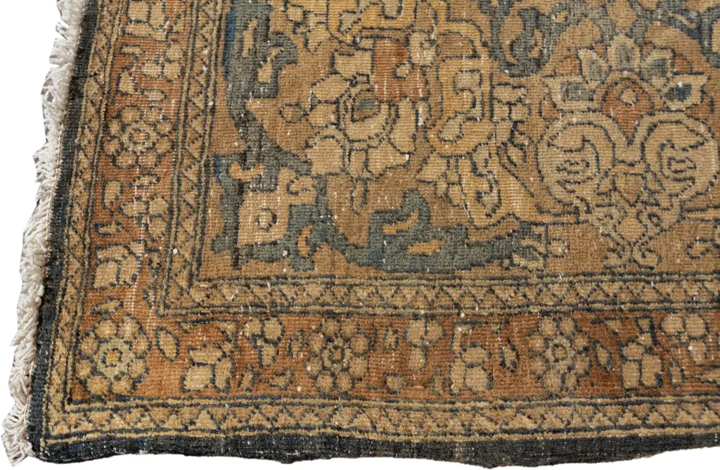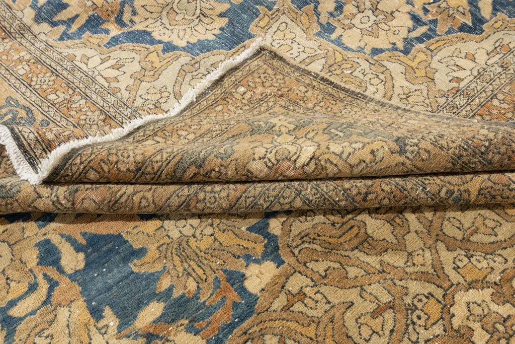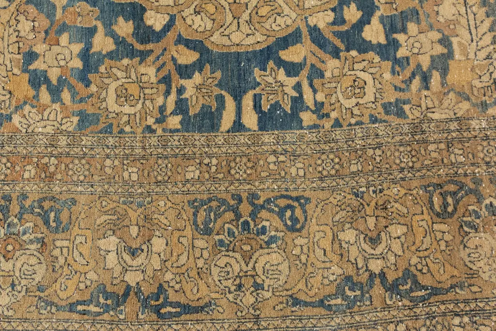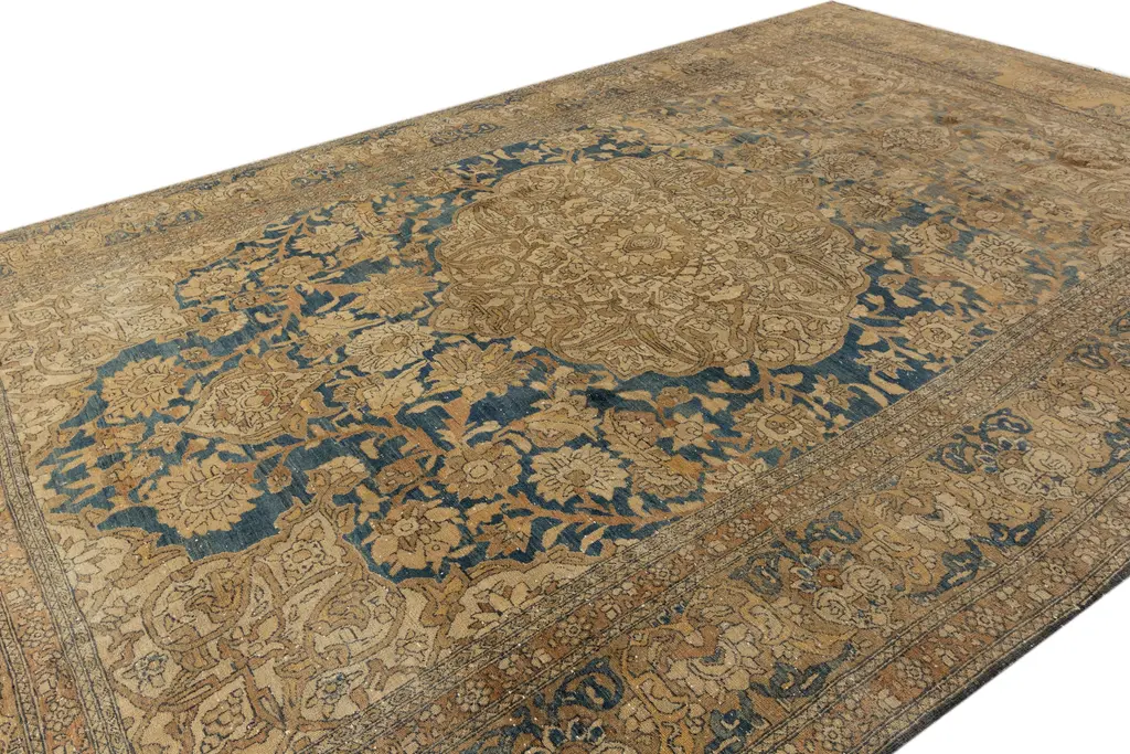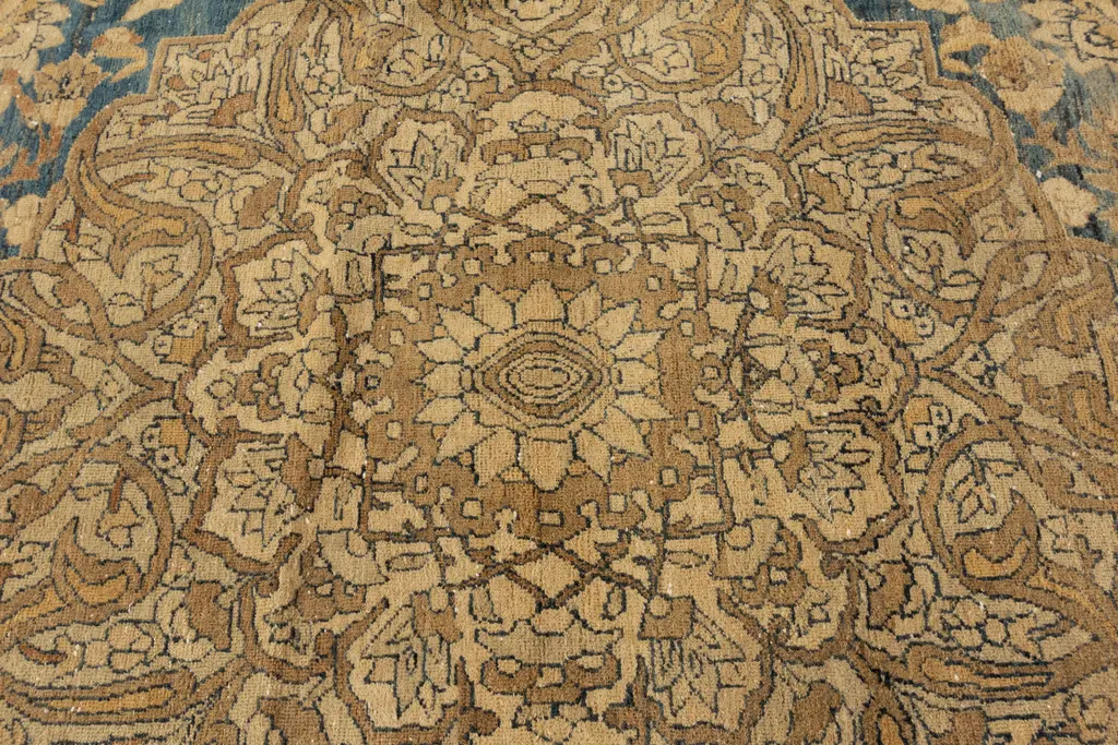 A 20th century antique Tabriz rug with a medallion brown and blue motif. This piece would be the perfect addition to your home. This rug measures at 9'2" x 14'3". Our Rugs are professionally cleaned before shipping.