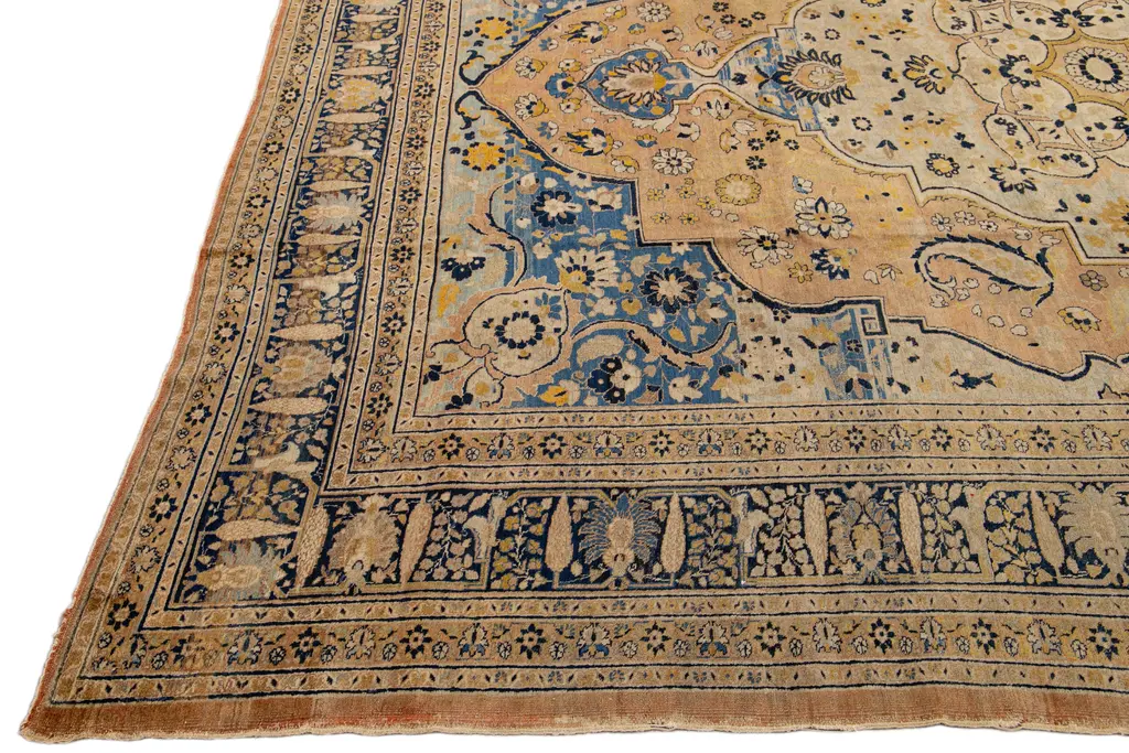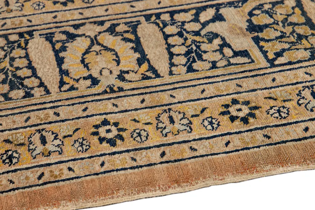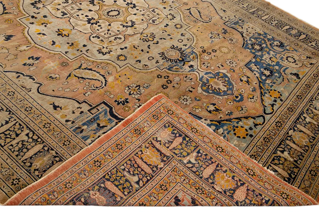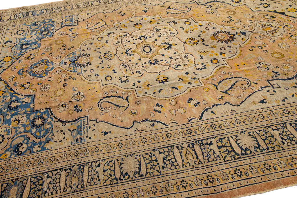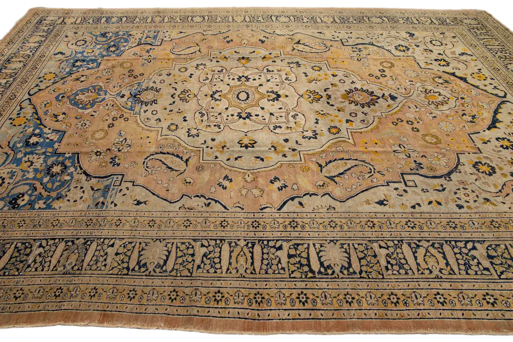 Beautiful antique Persian Tabriz hand-knotted wool rug with a light blue and peach field. This piece has a navy-blue frame and multicolor accents in an all-over gorgeous floral design. This rug measures: 9'6" x 13'2". Our Rugs are professionally cleaned before shipping.