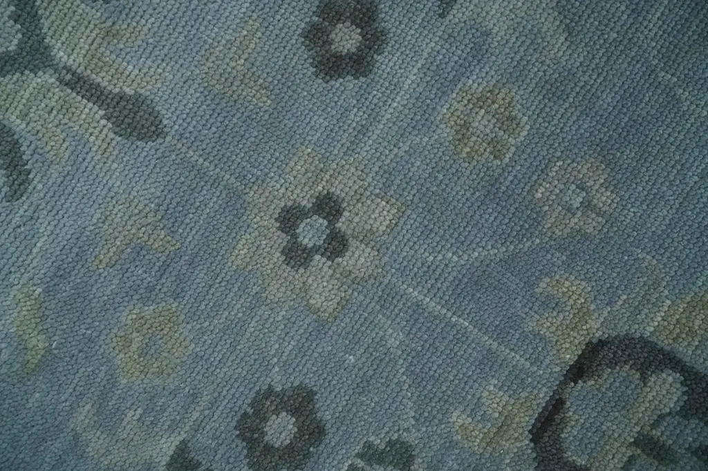 This blue, silver, and charcoal Oushak area rug has a timeless antique look. Hand-knotted with 100% wool, this piece is perfect for creating an elegant, unique style in any living space. Hand-Knotted SIZES ARE MADE TO ORDER IN 30-60 DAYS Made with Wool Color : Blue, Silver and Charcoal Made with 28 knots per square inch This specific rug is made in India, in the city of Bhadohi. Bhadohi is one of the biggest rug manufacturing cities. Carpet weaving in the region dates back to the 16th century during the reign of Akbar. The skilled artisans of Bhadohi have been carrying the tradition of rug-making for centuries. USERS GUIDE Avoid prolonged moisture Vacuum regularly and/or shake to remove dust Do not pull any loose threads. Use scissors to simply cut the ends The blot spills immediately with a white cloth. Harsh chemicals may damage or fade the rug Use rug protectors under heavy furniture
