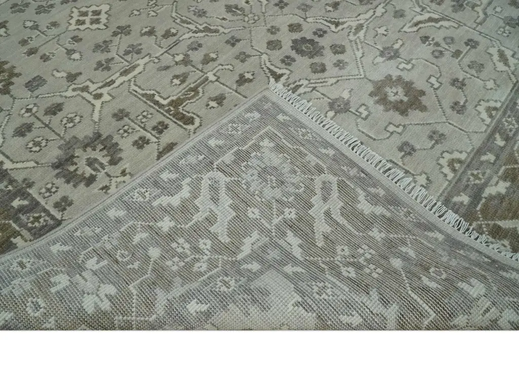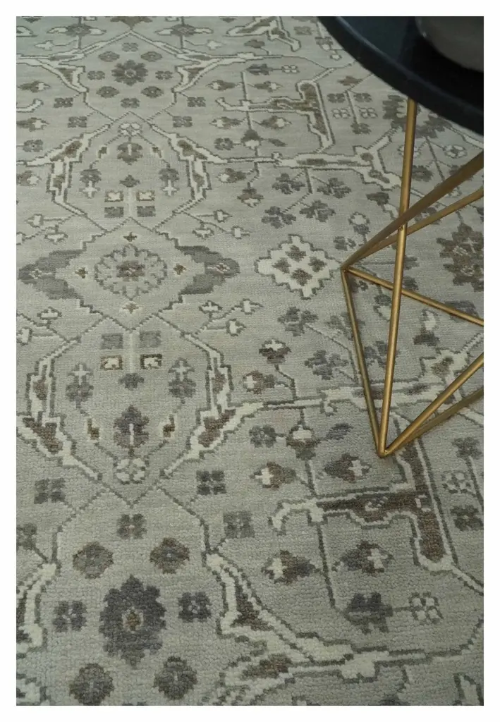 This Wool Area Rug features an antique look, a traditional design, and a beautiful color combination of silver and olive. Perfectly hand-crafted, this Oriental Oushak rug is custom-made and ideal for making a statement in your home. Hand-Knotted Made with Wool Made to Order in 30-45 Days Color: Silver and Brown This specific rug is made in India, in the city of Bhadohi. Bhadohi is one of the biggest rug manufacturing cities. Carpet weaving in the region dates back to the 16th century during the reign of Akbar. The skilled artisans of Bhadohi have been carrying the tradition of rug-making for centuries. USERS GUIDE Avoid prolonged moisture Vacuum regularly and/or shake to remove dust Do not pull any loose threads. Use scissors to simply cut the ends Blot spills immediately with a white cloth. Harsh chemicals may damage or fade the rug Use rug protectors under heavy furniture
