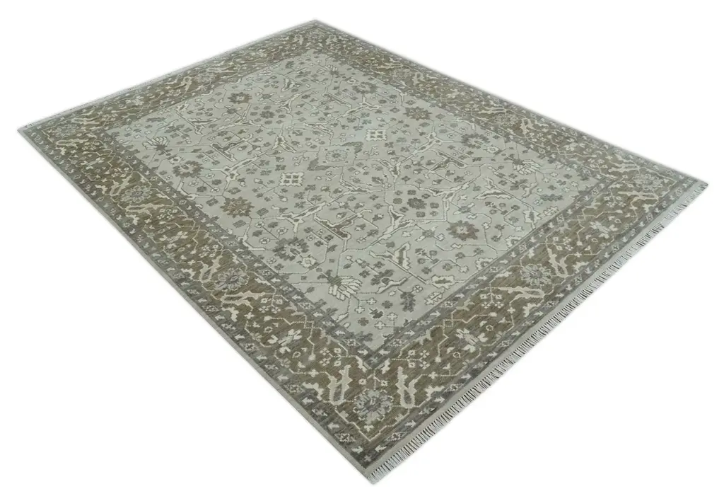 This Wool Area Rug features an antique look, a traditional design, and a beautiful color combination of silver and olive. Perfectly hand-crafted, this Oriental Oushak rug is custom-made and ideal for making a statement in your home. Hand-Knotted Made with Wool Made to Order in 30-45 Days Color: Silver and Brown This specific rug is made in India, in the city of Bhadohi. Bhadohi is one of the biggest rug manufacturing cities. Carpet weaving in the region dates back to the 16th century during the reign of Akbar. The skilled artisans of Bhadohi have been carrying the tradition of rug-making for centuries. USERS GUIDE Avoid prolonged moisture Vacuum regularly and/or shake to remove dust Do not pull any loose threads. Use scissors to simply cut the ends Blot spills immediately with a white cloth. Harsh chemicals may damage or fade the rug Use rug protectors under heavy furniture