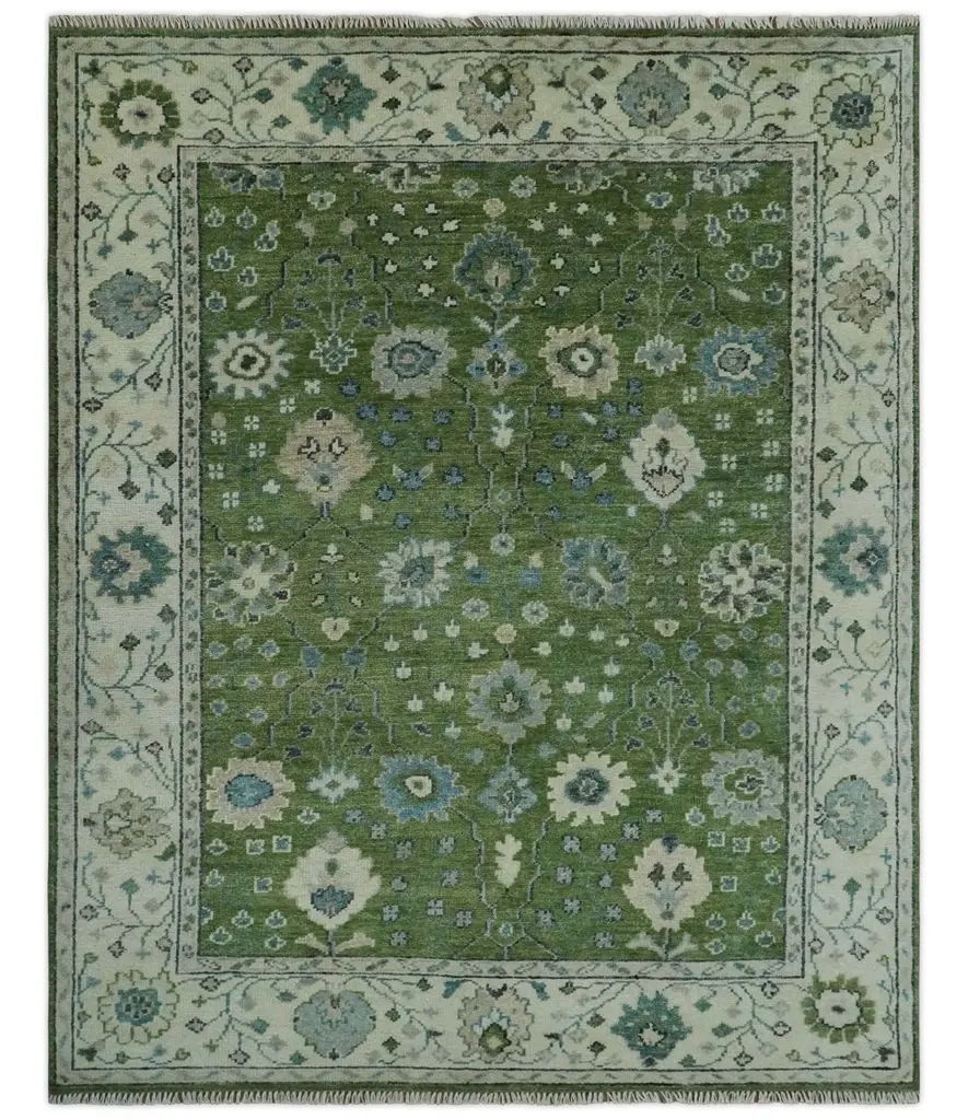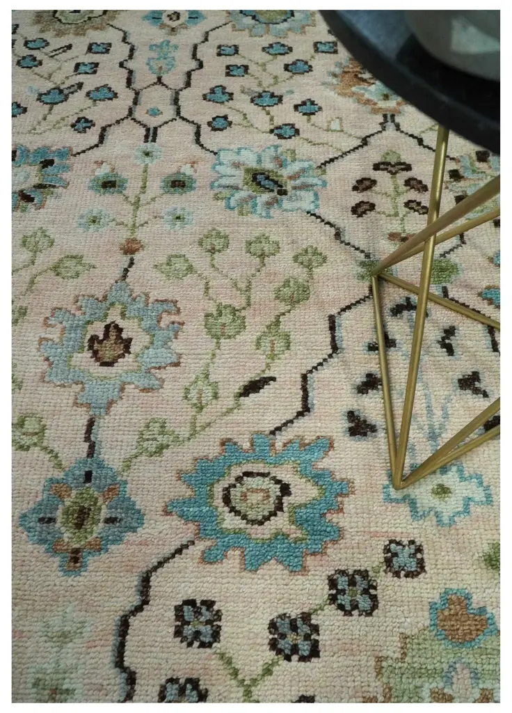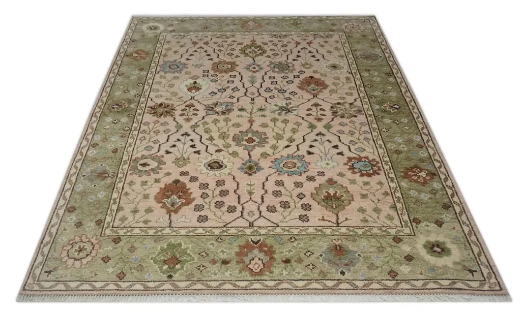 This luxurious rug features an exquisite blend of soft pastel tones, predominantly showcasing muted greens and delicate beiges, interspersed with intricate floral motifs. The central area is adorned with symmetrical, stylized blooms in gentle blues and earthy browns, linked by elegant vine patterns. The border harmonizes with the central palette, subtly echoing the inner designs. Its texture is plush and inviting, providing a touch of opulence that elevates any sophisticated setting, making it a timeless addition to luxury home decor. Product Details Color: Peach and Green Design: Antique Floral Material: Wool Construction: Hand-Knotted Knots Per Inch (KPI): 28 Size Options: Made to order in 30-45 days Care Guide Keep dry and protected from water damage Clean dust by vacuuming or shaking outdoors Cut loose threads with scissors instead of pulling Dab spills gently with clean white cloth; avoid harsh cleaners Place protective pads under furniture legs