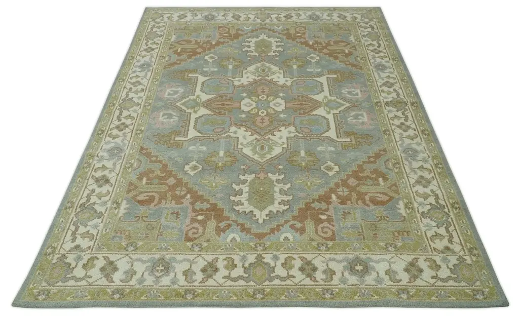 The Antique look Traditional Heriz Rug features a beautiful combination of gray, ivory, peach, and olive colors. Hand knotted from high-quality wool, this multi-size area rug adds an elegant touch to any room with its traditional design. Perfect for adding warmth and style to your living space. Hand-Knotted Made with Wool Made to Order in 30-45 Days Color: Gray, Ivory, Peach and Olive This specific rug is made in India, in the city of Bhadohi. Bhadohi is one of the biggest rug manufacturing cities. Carpet weaving in the region dates back to the 16th century during the reign of Akbar. The skilled artisans of Bhadohi have been carrying the tradition of rug-making for centuries. USERS GUIDE Avoid prolonged moisture Vacuum regularly and/or shake to remove dust Do not pull any loose threads. Use scissors to simply cut the ends The blot spills immediately with a white cloth. Harsh chemicals may damage or fade the rug Use rug protectors under heavy furniture