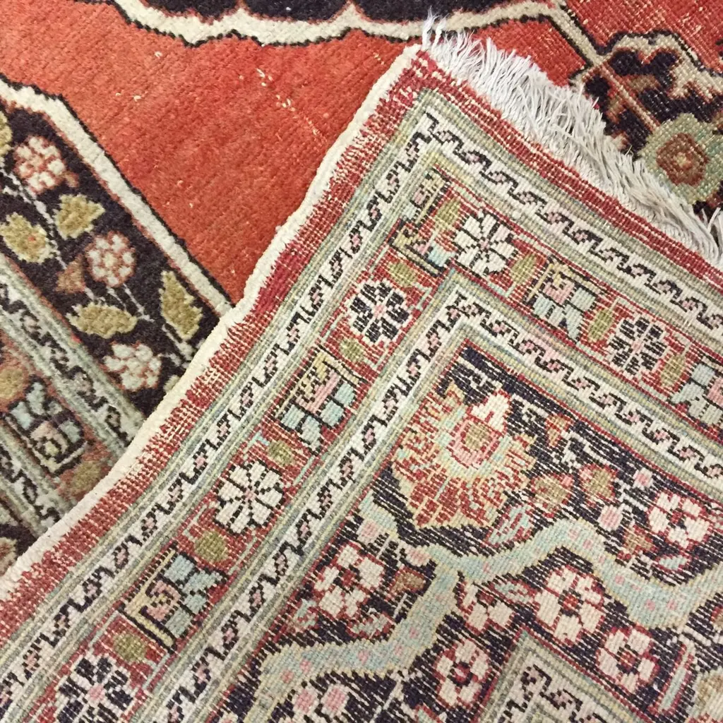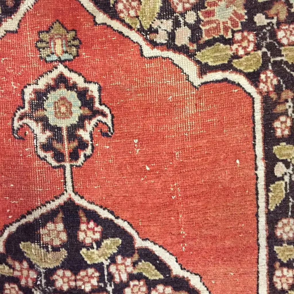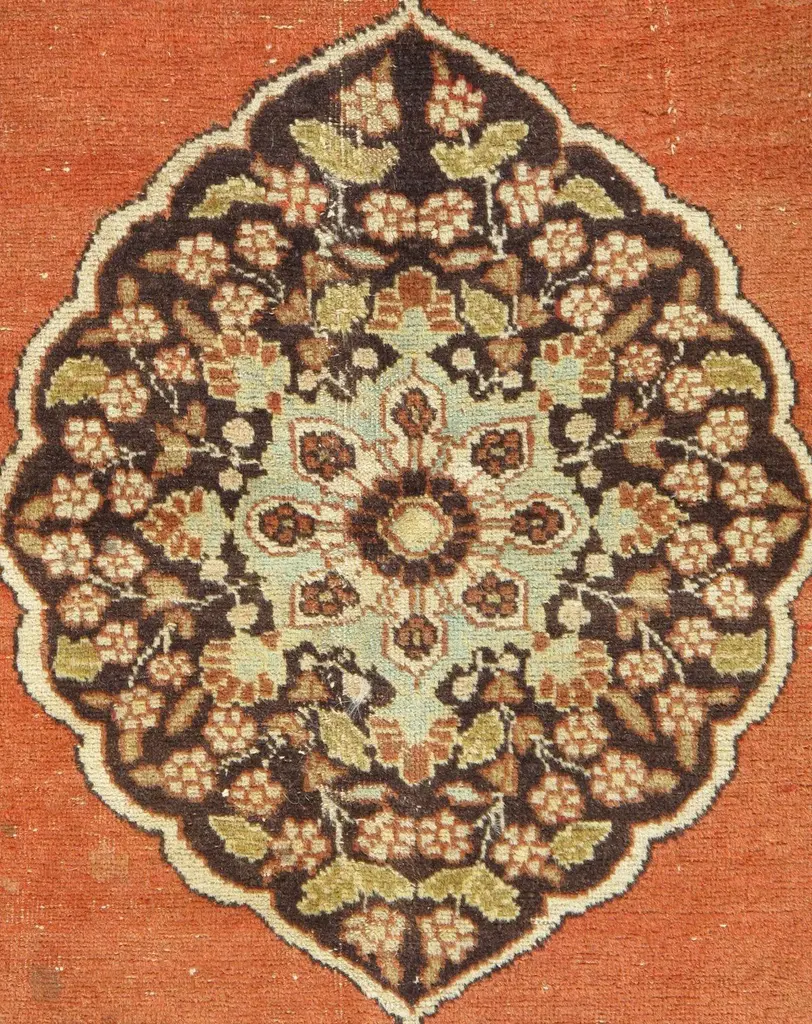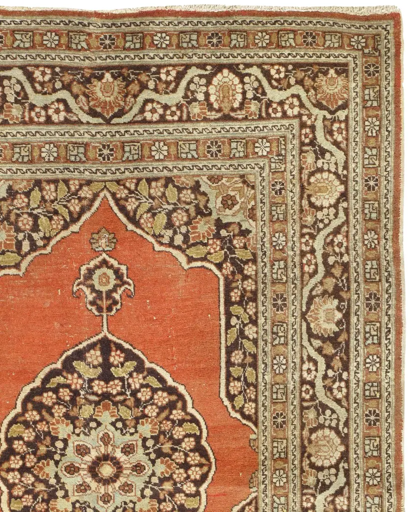 Antique handwoven Tabriz rug featuring a central medallion on a terracotta field. Minor age wear, low pile.