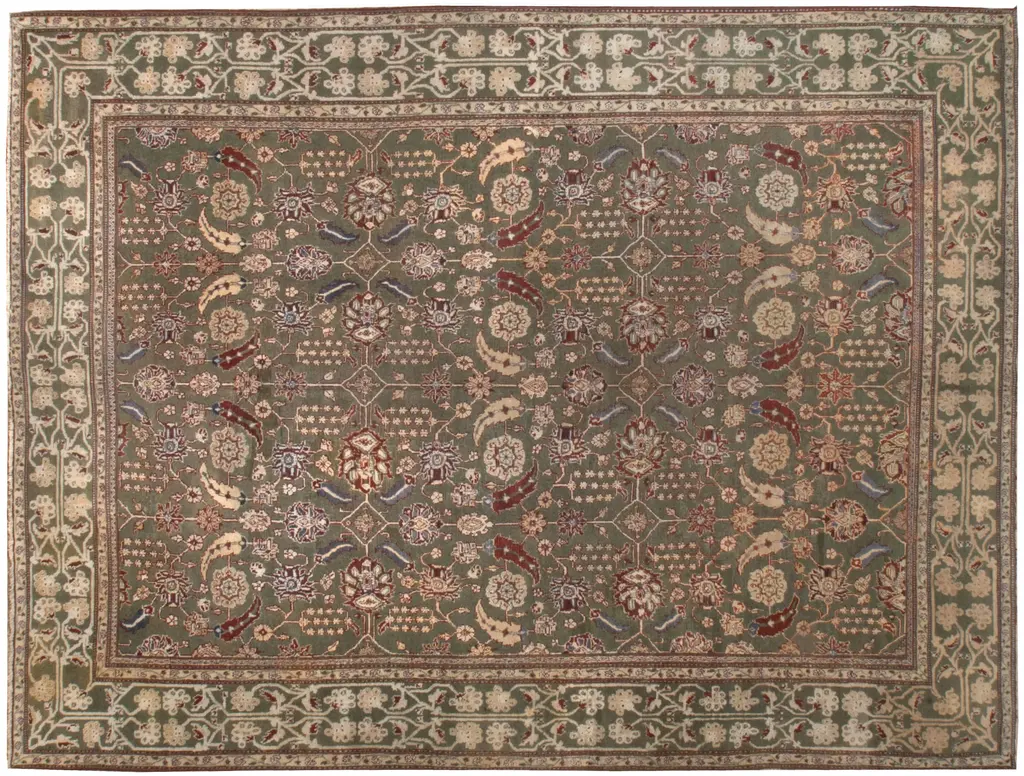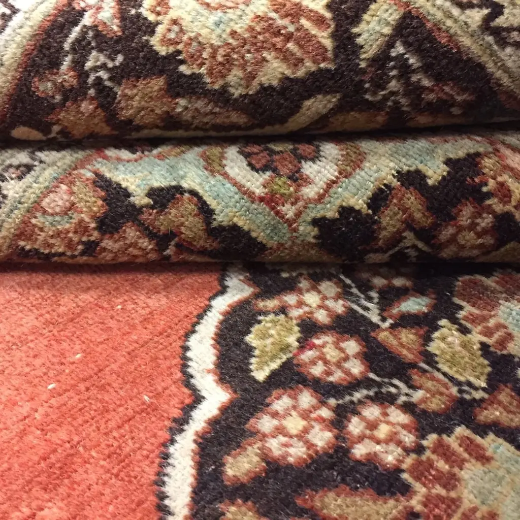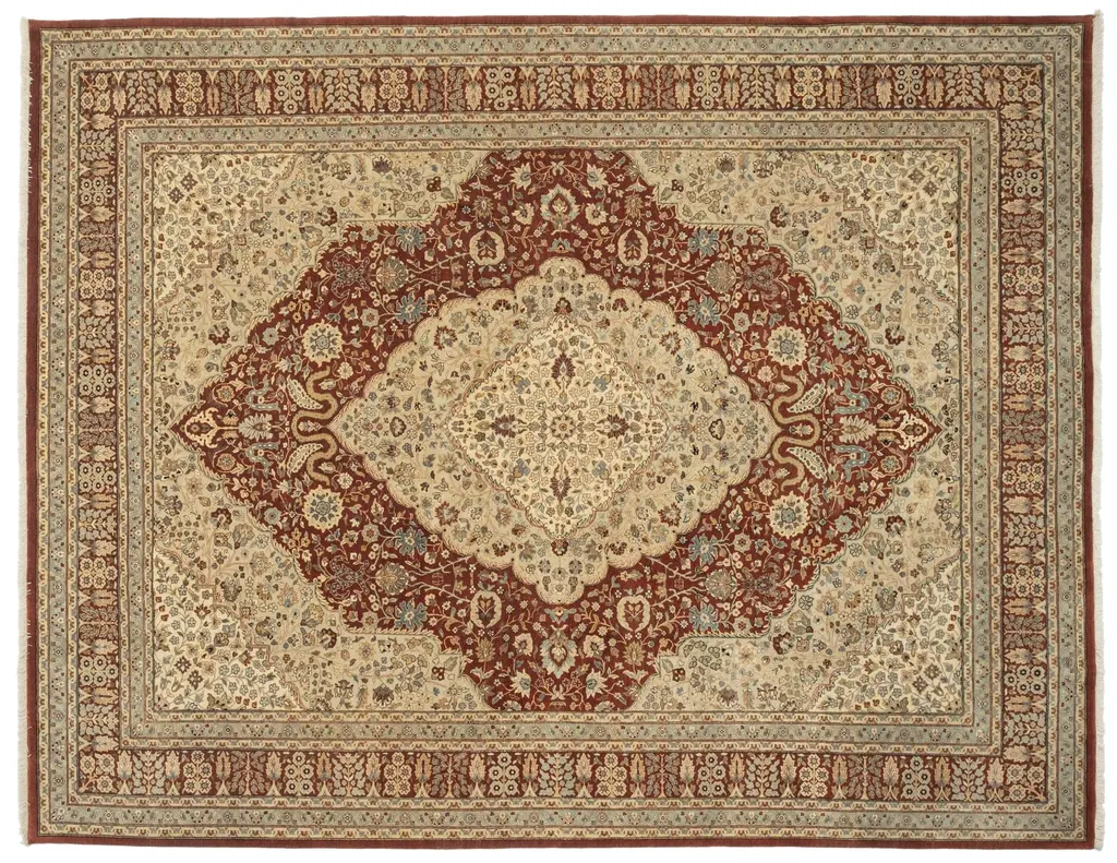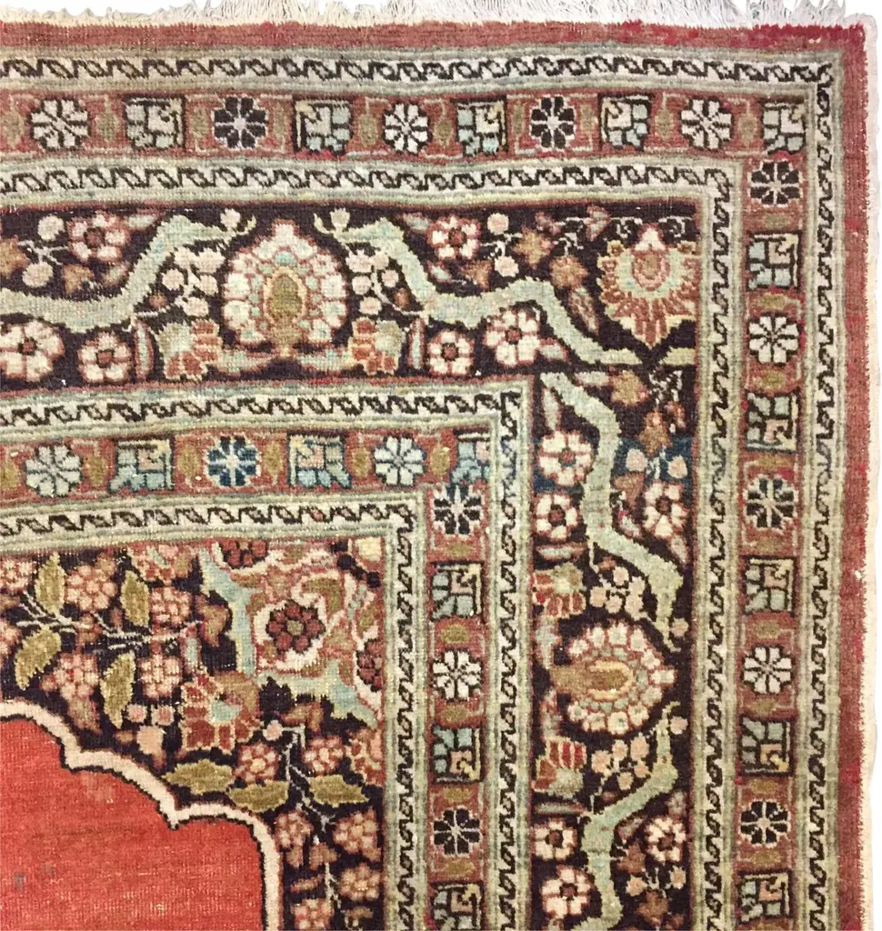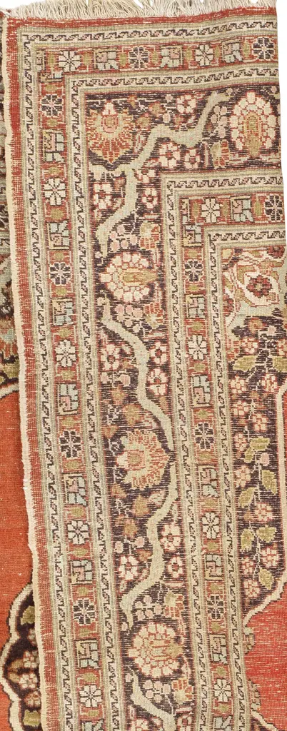 Antique handwoven Tabriz rug featuring a central medallion on a terracotta field. Minor age wear, low pile.