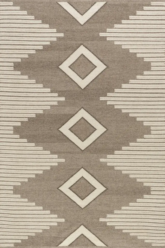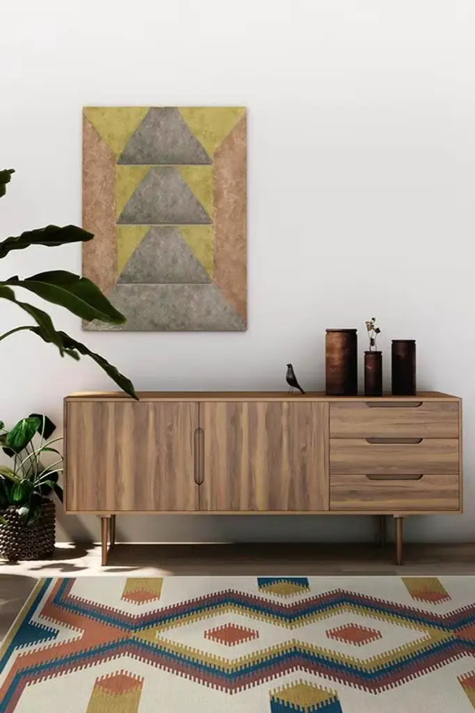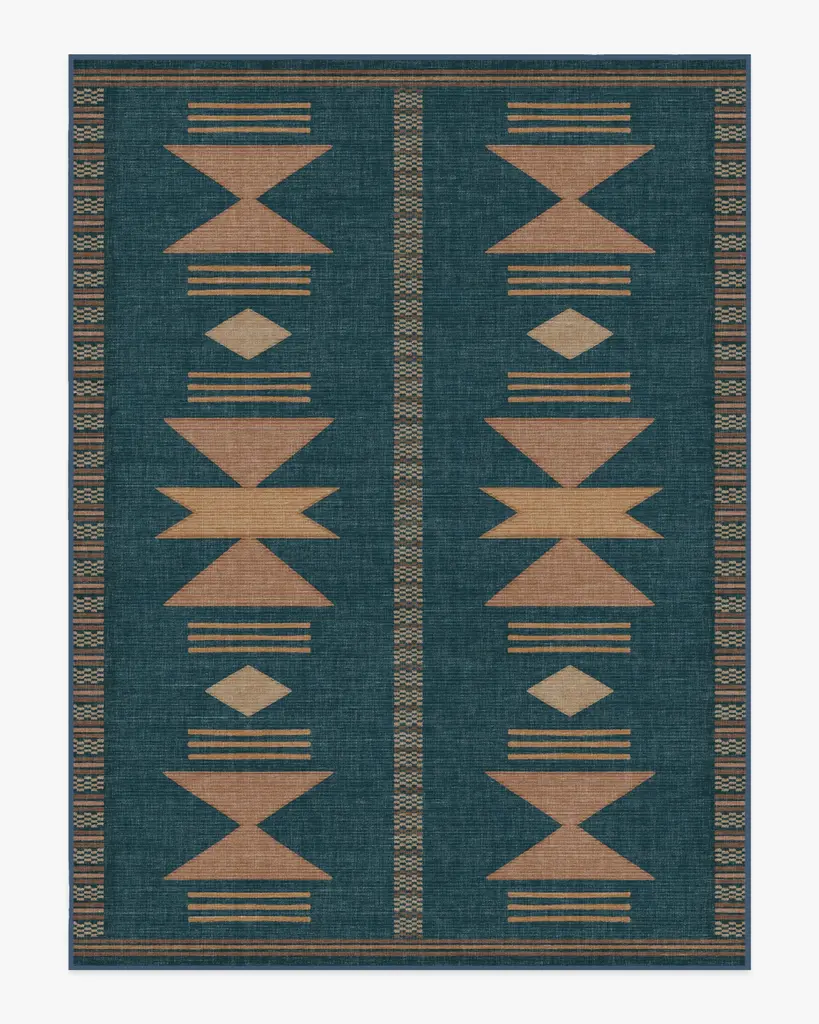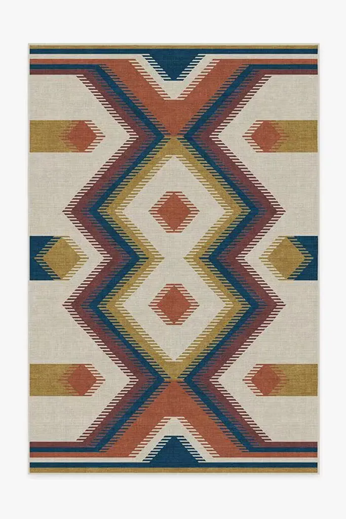 Anza Polychrome Rug showcases geometric weave-like patterns. Its dynamic design features a series of sleek lines and angular shapes, tinted in bright, playful colors of terracotta, ocean blue, and dijon.