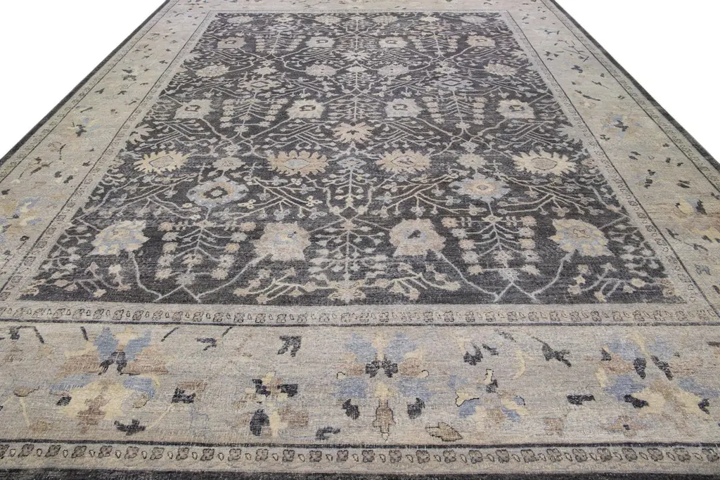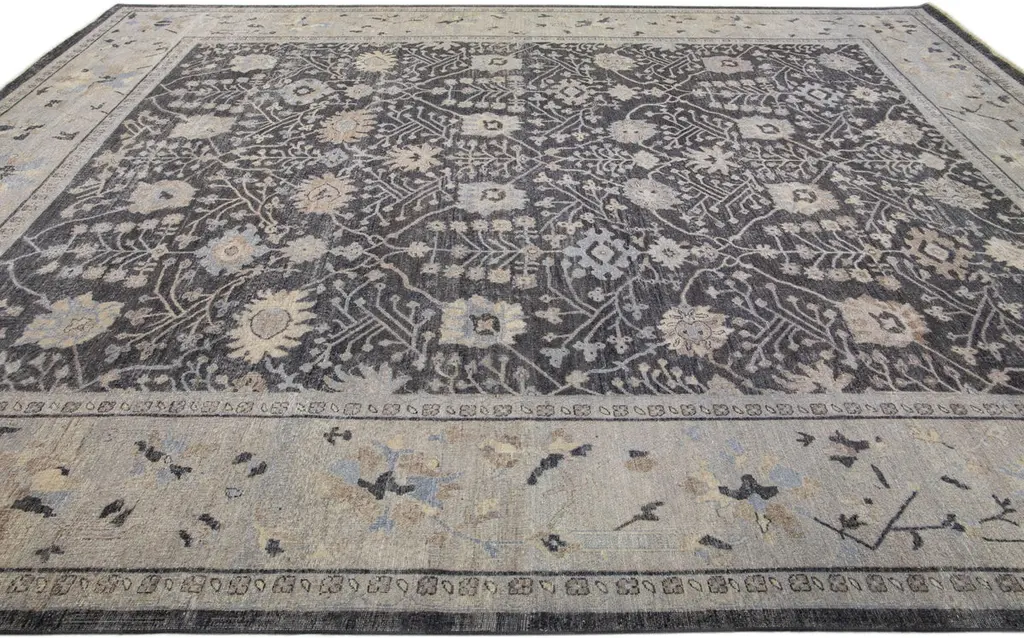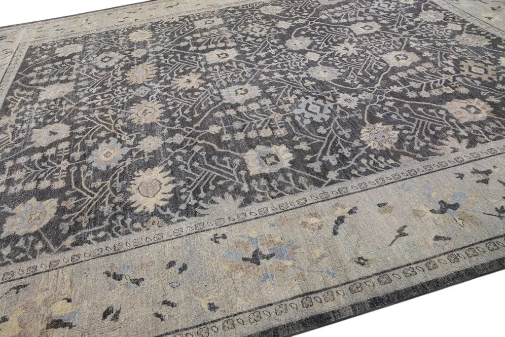 Apadana's Artisan line is an antique rug reimaging with an elegant way to inject a striking antique aesthetic into a space. This line of rugs is decidedly unique and reimagines what an antique rug look can be. Every single piece from our Artisan line is painstakingly woven by hand. This custom rug features a gorgeous all-over floral design with a charcoal-gray color field.This rug measures: 12' x 15'2".Our rugs are professional cleaning before shipping.