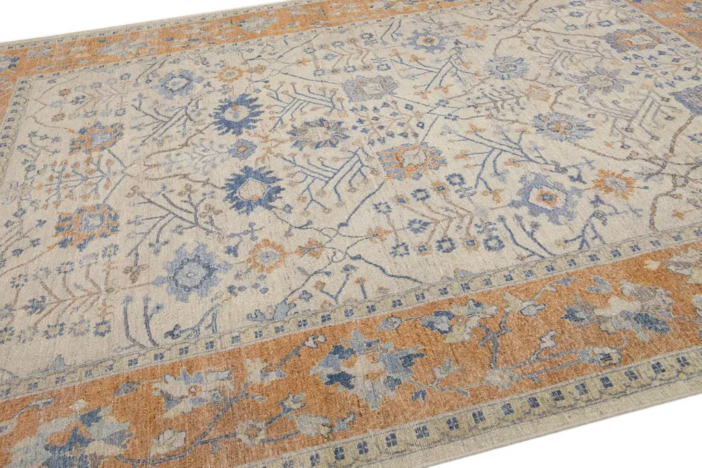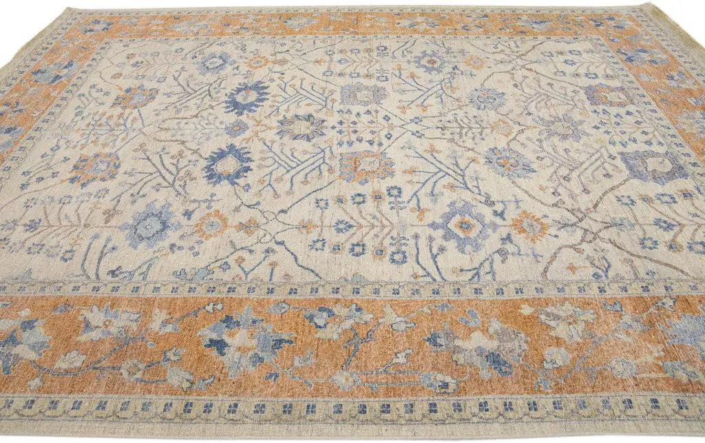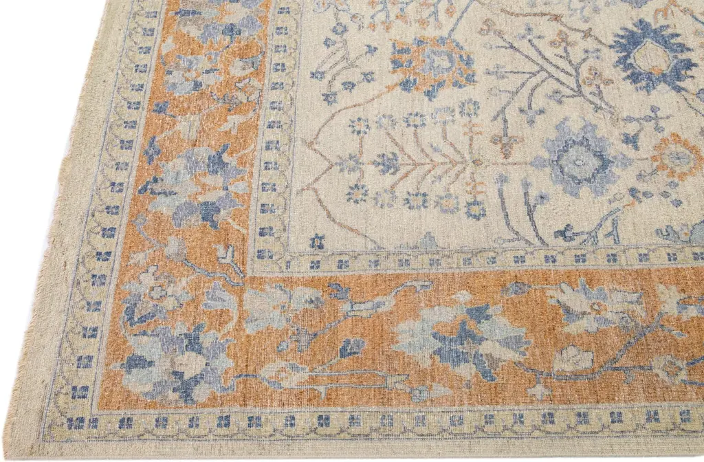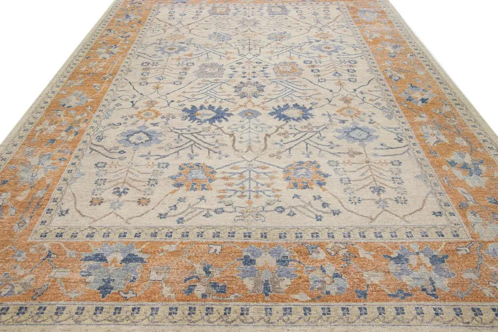Apadana's Artisan line is an antique rug reimaging with an elegant way to inject a striking antique aesthetic into a space. This line of rugs is decidedly unique and reimagines what an antique rug look can be. Every single piece from our Artisan line is painstakingly woven by hand. This custom rug features a gorgeous all-over floral design with a beige and orange color field.This rug measures: 9'1" x 12'4".Our rugs are professional cleaning before shipping.