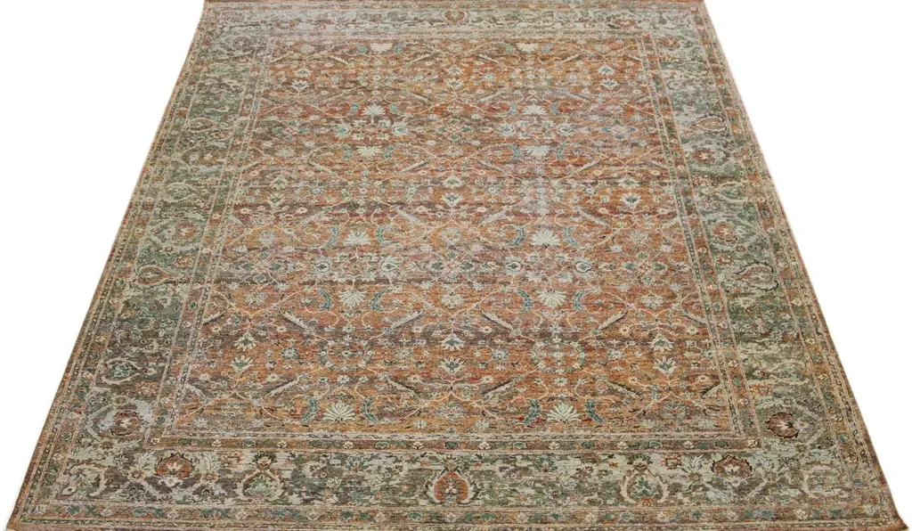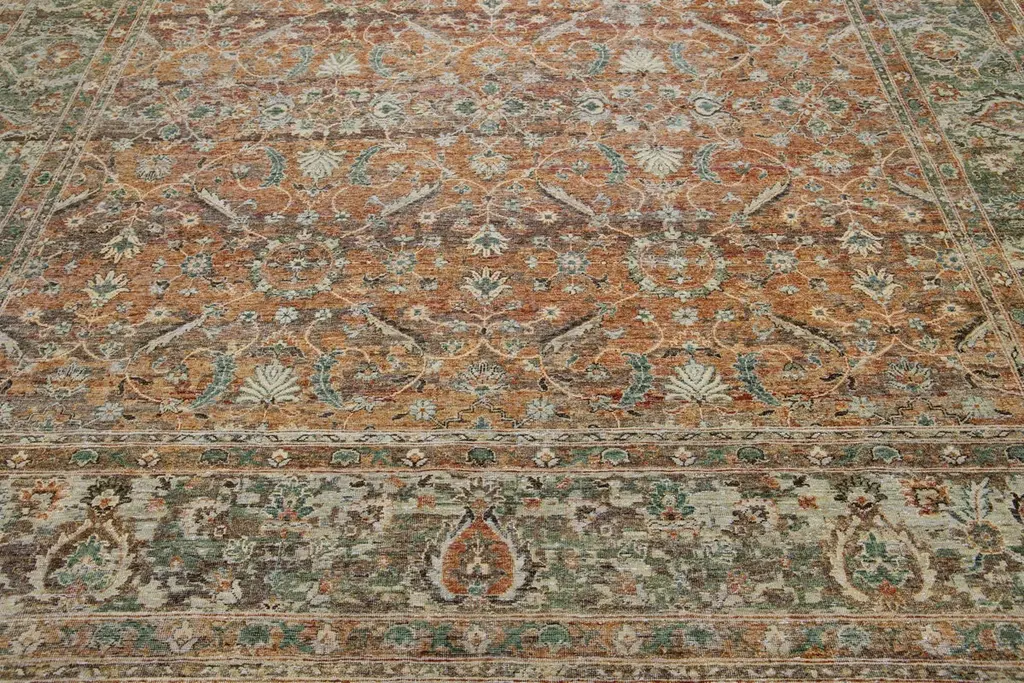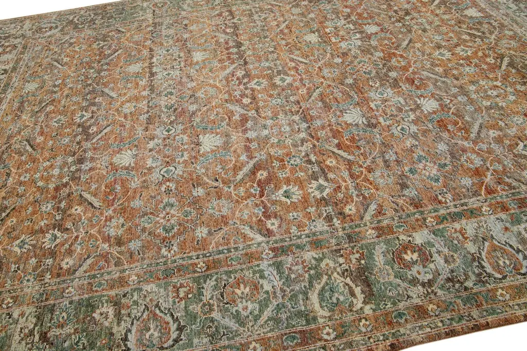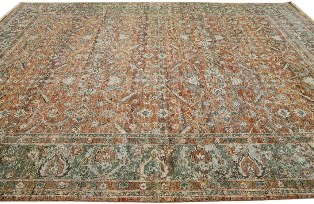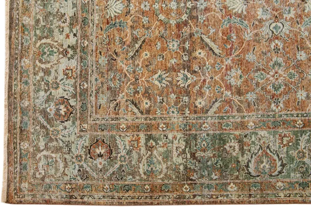 The Apadana Artisan line offers an innovative way to inject a regal old-world charm into any space. Every rug from this line has been dutifully crafted by hand and exhibits a timelessly unique aesthetic. The rug features a beautiful floral pattern across a copper background with accenting green hues. This stylish and exquisite custom rug will surely imbue your space with a sense of timeless elegance.This rug measures: 9'9" x 13'10".Our rugs are professional cleaning before shipping.