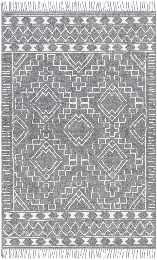 Collection: Apalachicola Colors: Charcoal, Cream Construction: Hand Woven Material: 60% Wool,40% Polyester Pile: Low Pile Pile Height: 0.2" Styles: Bohemian/Global Made In: India Thickness: 0.2" Fringe Length: 2" Price Range: $$$$$ (Affordable)
