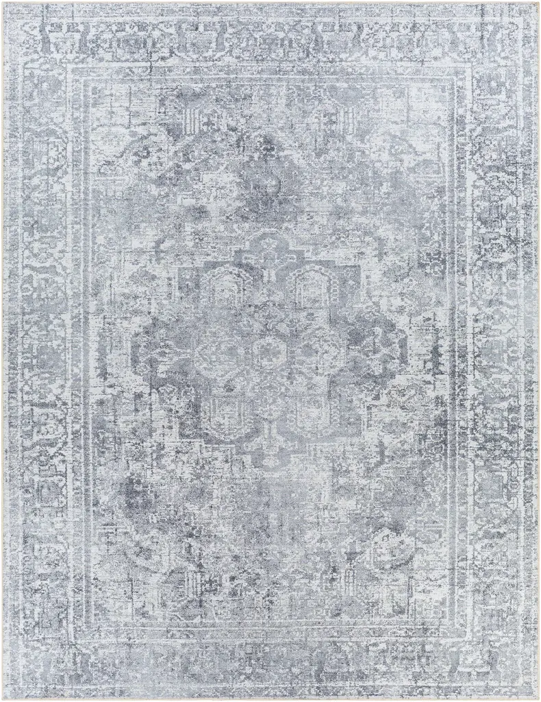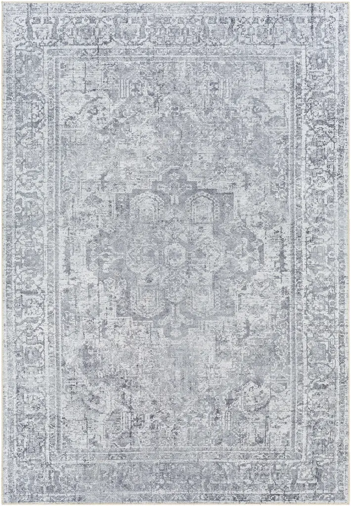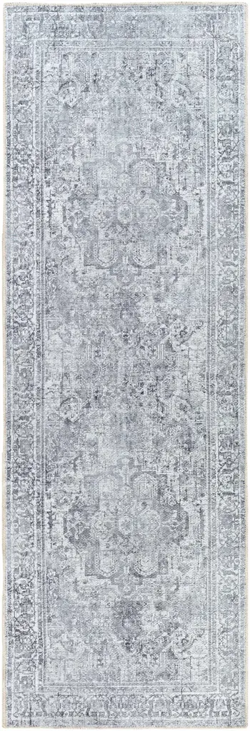 Collection: Aquino Colors: Charcoal, Gray, LightGray Construction: Machine Woven Material: 100% Polyester Pile: Low Pile Pile Height: 0.04" Styles: Traditional Machine Washable: Yes Made In: Turkey Thickness: 0.08" Price Range: $$$$$ (Affordable)