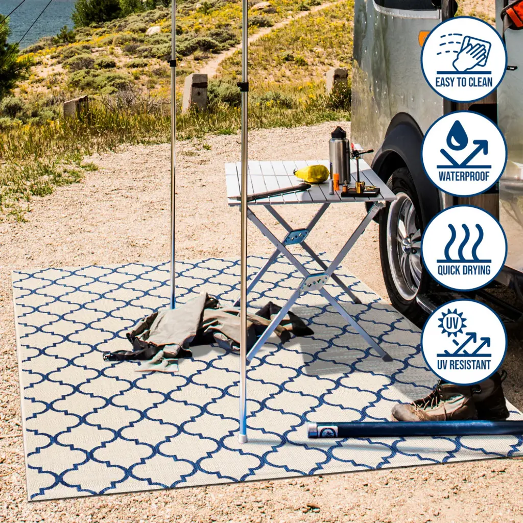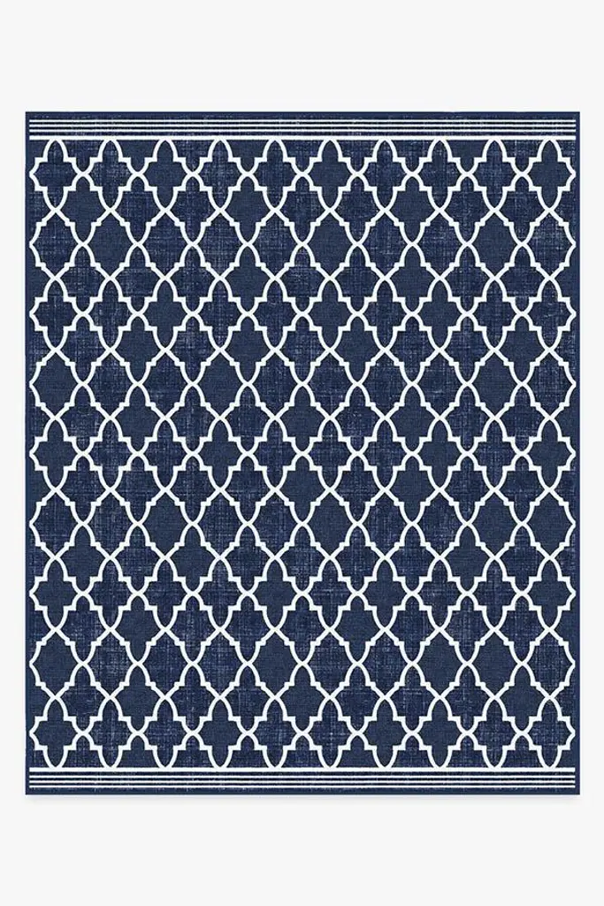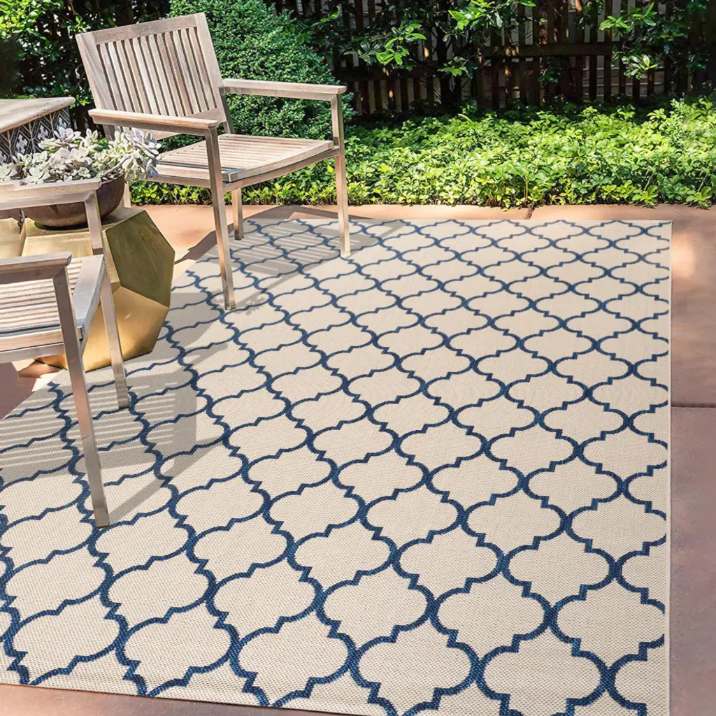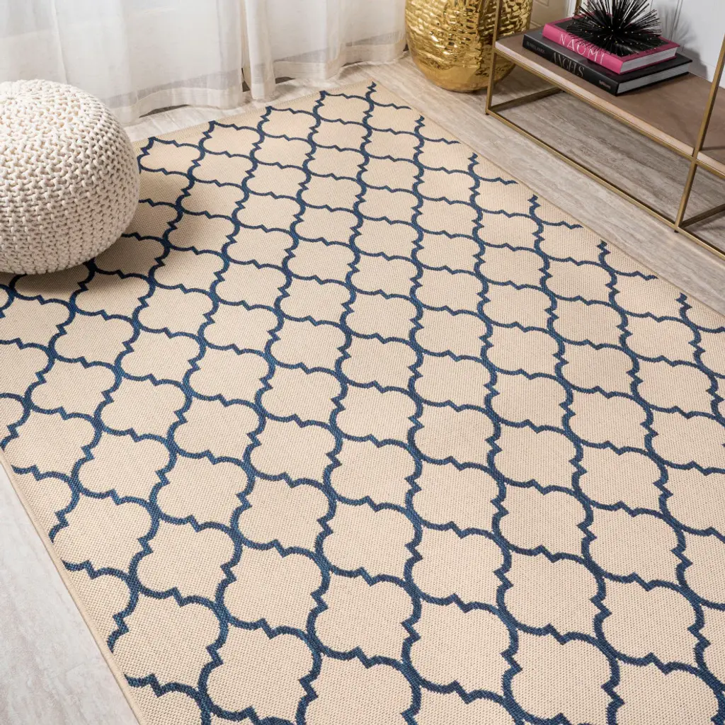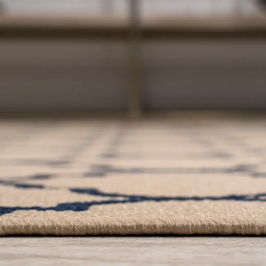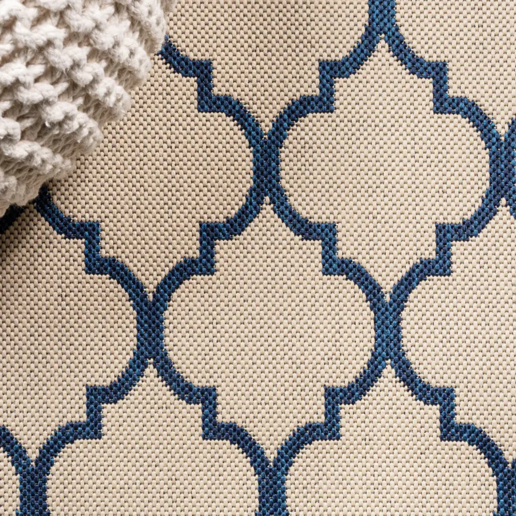 Inspired by the tile floors of Morocco, this indoor/outdoor rug adds elegant pattern to your porch, patio or sunroom. The ogee-curved trellis woven in navy adds graphic punch to a beige background. Mingled threads give this pattern a handwoven, vintage vibe that''s perfect for an entry, kitchen, hallway, living room or bedroom too. The pet-friendly and kid-proof flatweave design makes it easy to clean, and perfect for the beach house.Features:• Flat-weave construction of 100% polypropylene• Durable and easy-care - just sweep or hose down with mild soap and water• 100% Polypropylene• No backing, use of rug pad is recommended (sold separately)• Power Loomed in Turkey• Thickness measures: 0.19 in.• Available in multiple sizes and/or colorsRug Care:• Durable and easy-care - just sweep or hose down with mild soap and water• Packing and shipping may cause temporary creases in rugs, which will flatten out after a week on the floor; to expedite the process, try back-rolling your rug before laying it down, and then allow ample time for the remaining creases to relax• Please Note: Due to differences in monitors, some rug colors may vary slightly. Lengths and widths may vary from the published dimensions. Patterns may vary slightly according to shape and size selected.About us:Style your floors with JONATHAN Y. By combining fine craftsmanship and design, this New York creative studio is bringing fashion to your floors. The collection mixes sustainable organic materials, vibrant colors and trend worthy styles to create JONATHAN Y''s distinctive catalog of rugs.