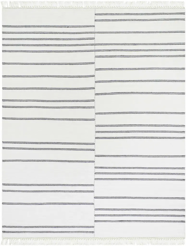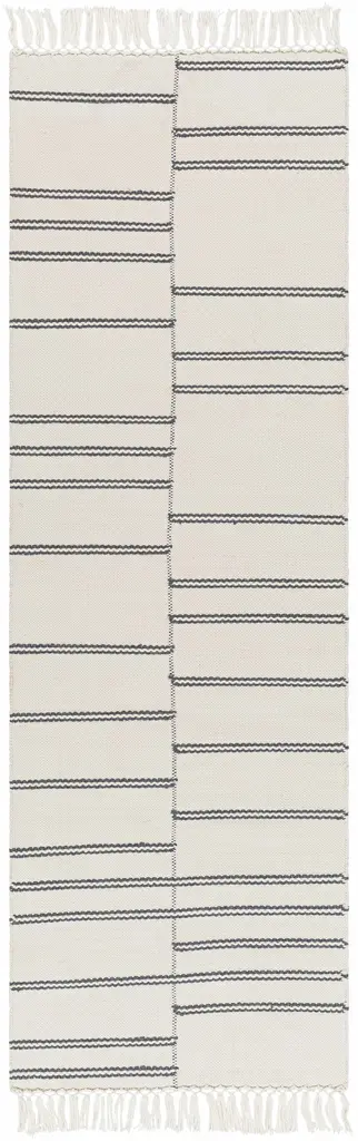 Collection: Aras Colors: Off White, Medium Gray, Gray Construction: Hand Woven Material: 100% RecycledPETYarn Pile: No Pile Styles: Transitional,Traditional Made In: India Thickness: 0.12" Fringe Length: 3.5" Price Range: $$$$$ (Affordable)