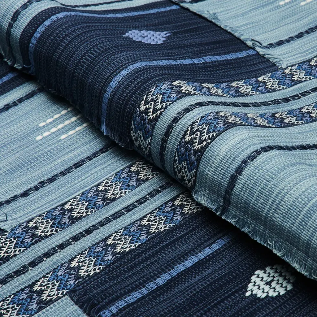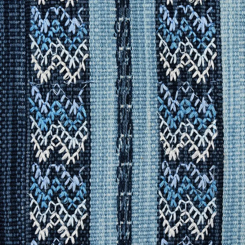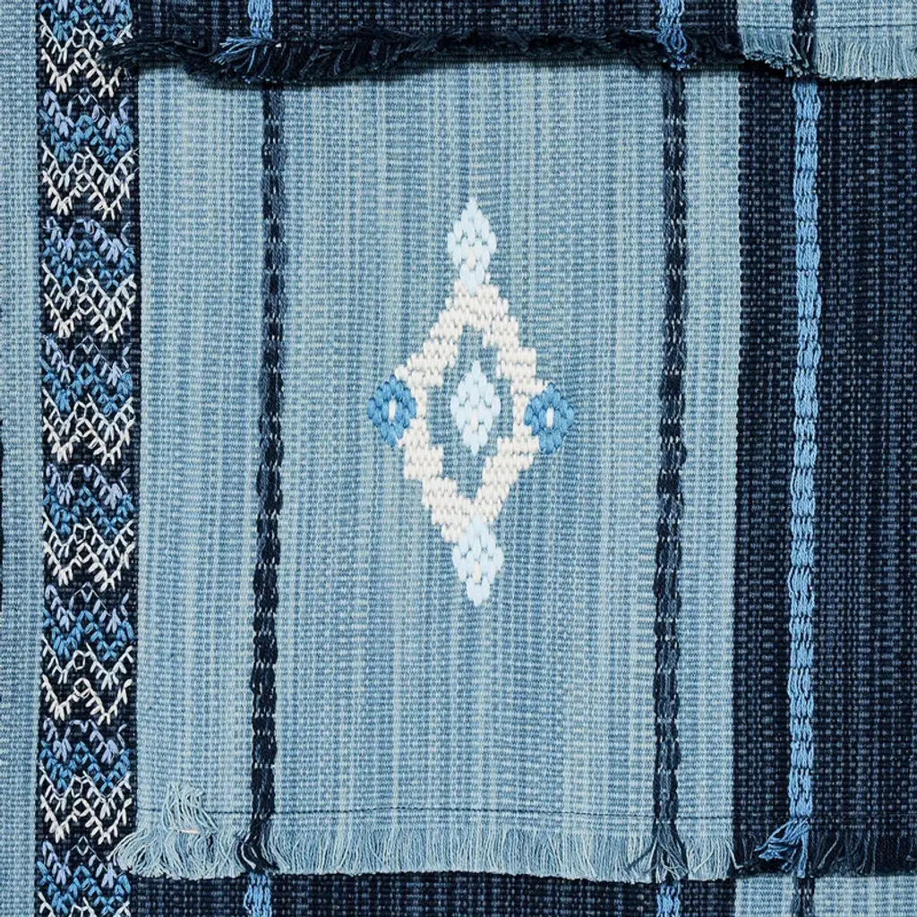 Inspired by the rich colors and tribal symbols associated with Berber rugs, Aravali Patchwork in cerise-and-ink is a woven geometric design that combines checks, stripes and delicate embroidered motifs. Made of hand-dyed cotton yarns, it has a wonderful strié effect and a patchwork construction that enhances the textural look of this unique upholstery-weight fabric.