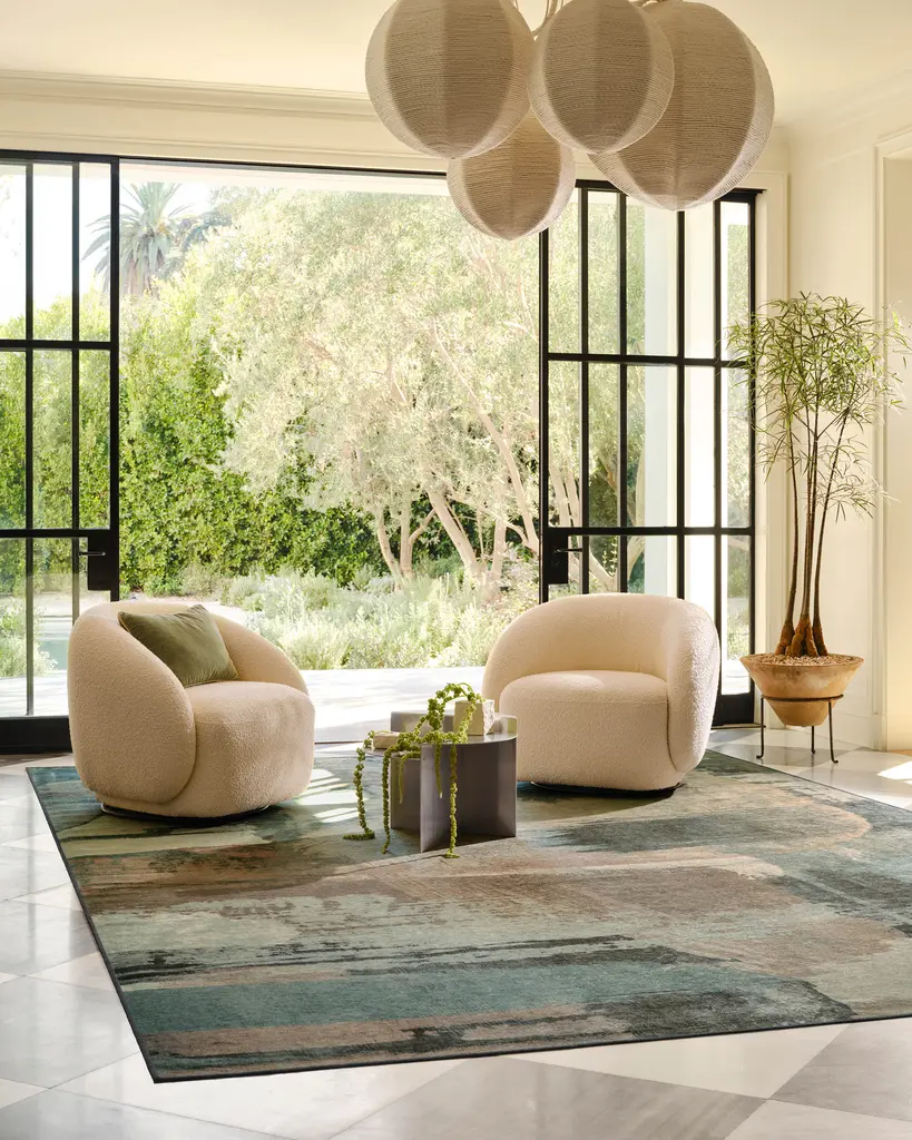 Bring home high-end design with our Architectural Digest Dresden Shadow Multicolor Rug. This industrial-inspired design features broad, painterly strokes of varying weights, engineered to create an abstract composition of movement and layering. Its balanced palette of warm and cool tones blends light creams and sages with dark teals and deep browns. Water-resistant, stain-resistant, and machine-washable. Rug colors may vary slightly according to your device and the lighting in your space.