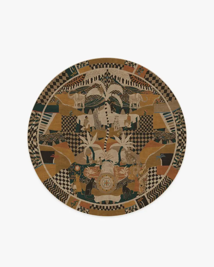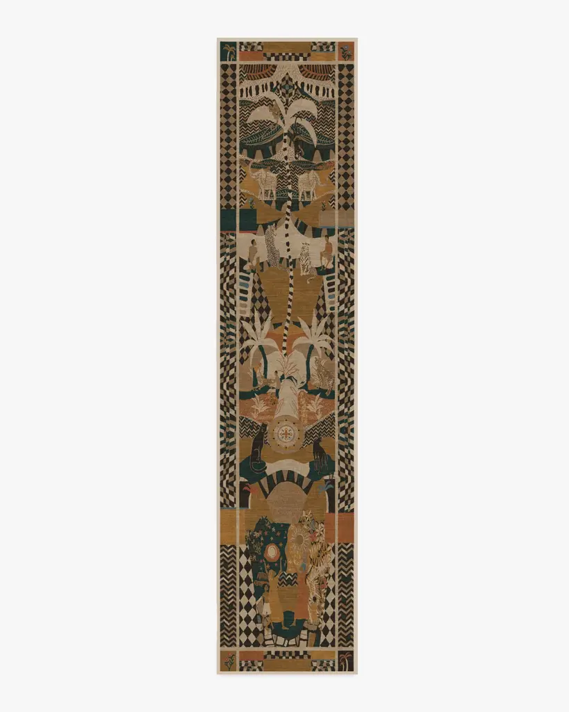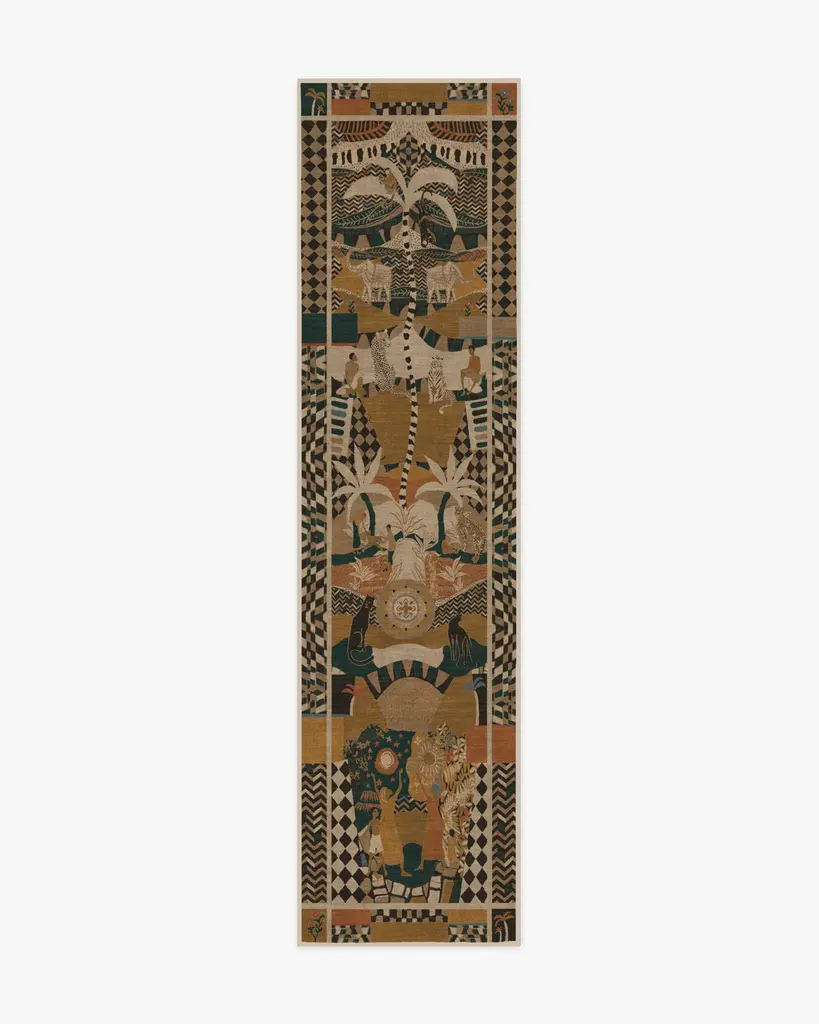 Make inspiration reality with our Architectural Digest La Joie Natural Multicolor Rug, designed by David Quarles IV. Drawing inspiration from imaginative artists like Kehinde Wiley, Dali, Frida Kahlo, and Basquiat, this design is a visual storytelling of the Garden of Eden. Its colorful display of figures, nature, and animals weaves a folky, patchworked composition that exudes a tropical, joyful ambiance. Taupe, charcoal, mustard, ginger, teal, and coral play atop a cream background. Water-resistant, stain-resistant, and machine-washable. Rug colors may vary slightly according to your device and the lighting in your space.