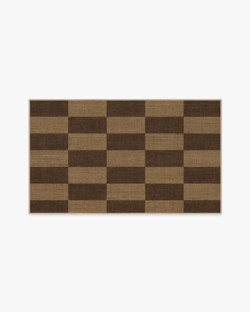 Our Architectural Digest Yates Check Brown Rug, designed by Light and Dwell, remixes classic elegance with a modern twist. Its rectangular, checkered design boasts lush textures, while the natural imperfections add character to its structured appearance. The rich chocolate brown hues stand out against a warm sand background. The woven jute-like material is made from up to 180 recycled plastic bottles per rug, recycled and virgin polyester, and polyurethane that won't shed or fray. Water-resistant, stain-resistant, and machine-washable. Rug colors may vary slightly according to your device and the lighting in your space.