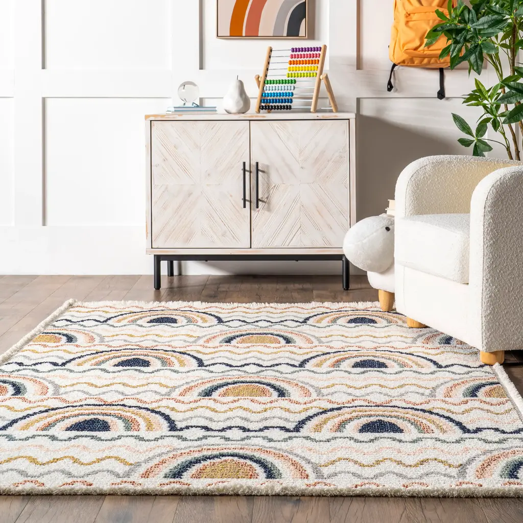 Bring a splash of vibrance to your nursery or children's bedroom with this stunning rug that is available to you in a variety of sizes. The inviting shades add just the right amount of softness, combined with a durable fabrication. Each corner of this beautifully designed floor covering features something else that will captivate anyone who sees it. Designed to enhance any room it's placed in, this pet-friendly and easy to clean area rug comes in an assortment of sizes.