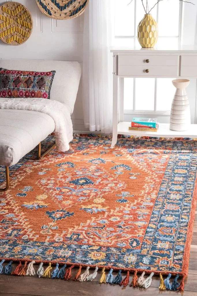 Finished with tasseled sides in multiple colors, this wool rug updates a detailed traditional design with a bold, modern color palette. We recommend a rug pad to extend the life of your rug and keep it securely in place.