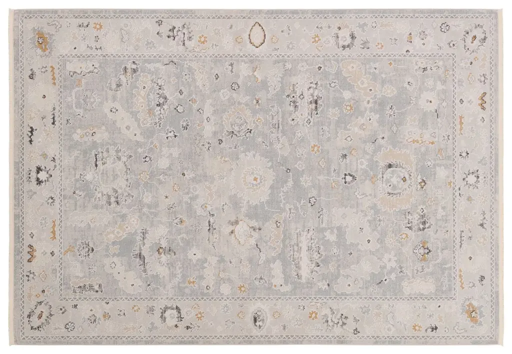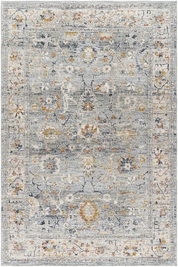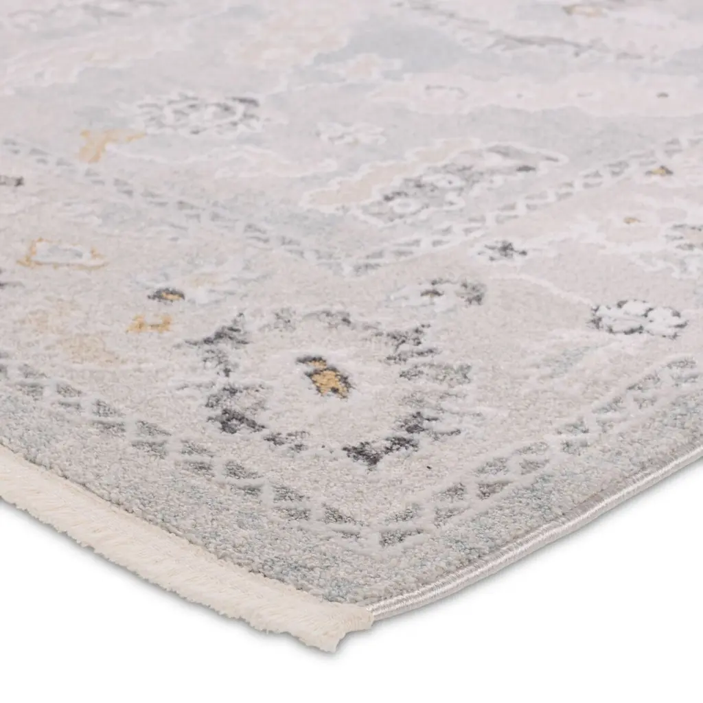 The cool gray, cream, tan, and subtle blue tones of this area rug create a soothing effect in any space. Traditional floral, Oushak designs, a thick border, high-low pile, and short cream fringe establish a global style. Crafted of stain and water-resistant polyester and polypropylene, this easy-to-clean rug withstands both high and low traffic, as well as homes with children and pets.