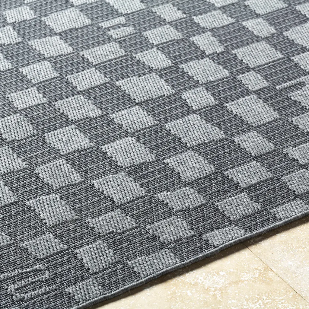 Collection: Arifah Colors: Gray, Dark Purple Construction: Machine Woven Material: Face: 100% Polypropylene / Warp: 100% Polyester Pile: No Pile Styles: Transitional,Traditional Outdoor Safe: Yes Made In: Turkey Thickness: 0.2" Price Range: $$$$$ (Most Affordable)