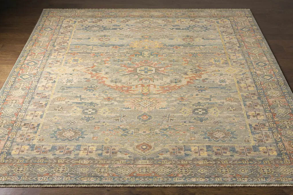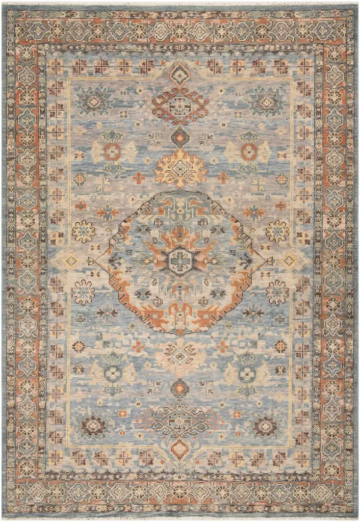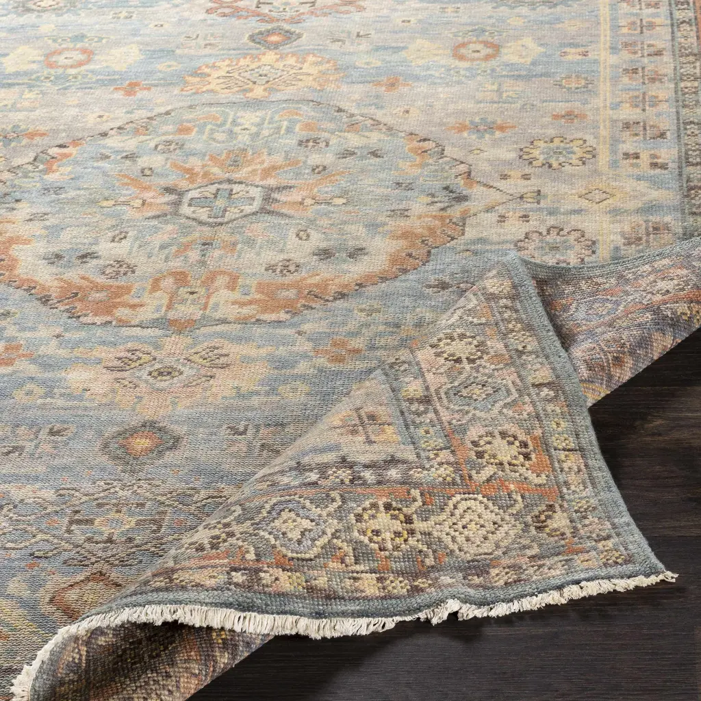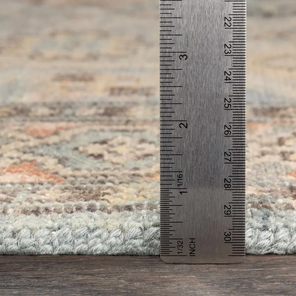 Collection: Aripeka Colors: Blue, Medium Gray, Sage, Sky Blue, Tan Construction: Hand Knotted Material: 100% Wool Pile: Low Pile Pile Height: 0.15" Styles: Traditional Made In: India Thickness: 0.25" Fringe Length: 0.5" Price Range: $$$$$ (Premium)