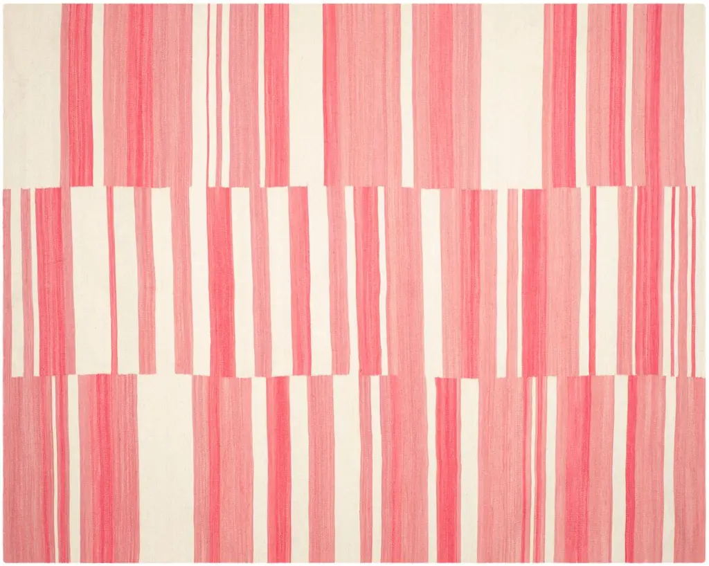 Handwoven of wool, this flat-weave enlivens any space with its off-kilter stripe design in pink and ivory. We recommend a rug pad to extend the life of your rug and keep it securely in place.