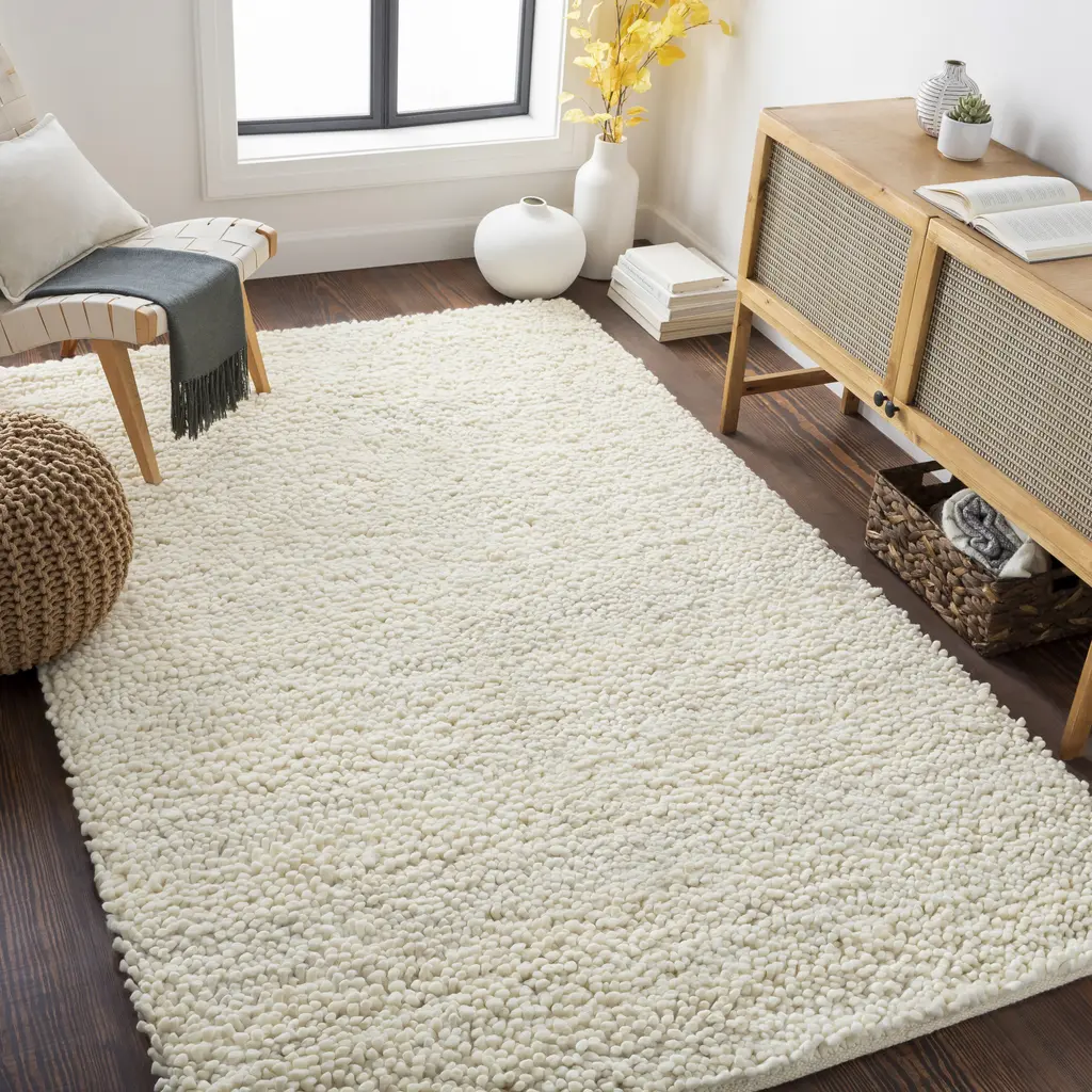 The simplistic yet compelling rugs from the Aros Collection effortlessly serve as the exemplar representation of modern decor. The meticulously woven construction of these pieces boasts durability and will provide natural charm into your decor space. Made with Wool in India, and has High Pile. Spot Clean Only, One Year Limited Warranty.