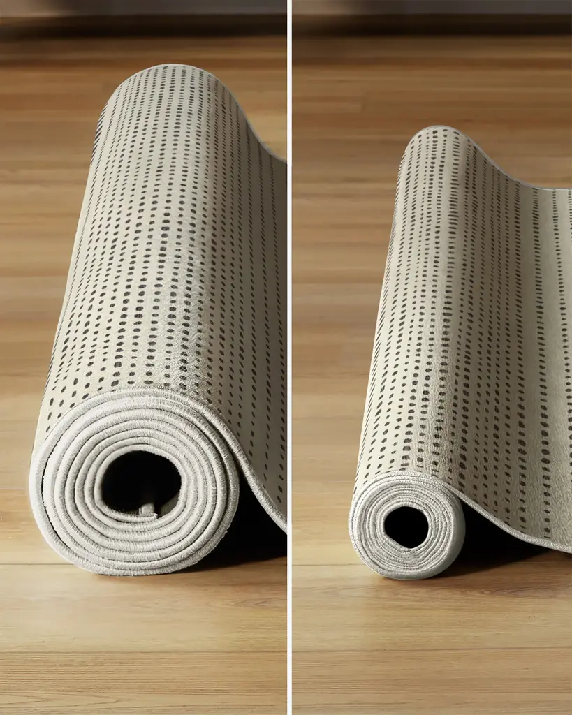 Give your favorite room an upgrade with our Array Black & Ivory Rug. This modern and clean design showcases high-contrast charcoal black stripes and repeating dotted lines against an ivory background, creating a unique play on perspective. Water-resistant, stain-resistant, and machine-washable. Rug colors may vary slightly according to your device and the lighting in your space.