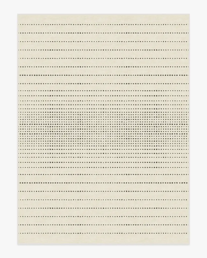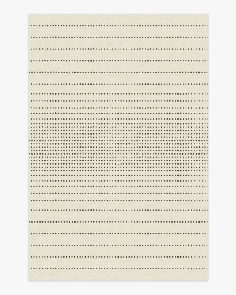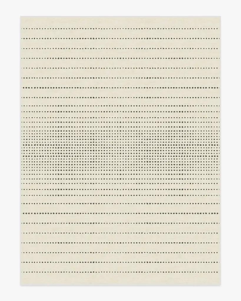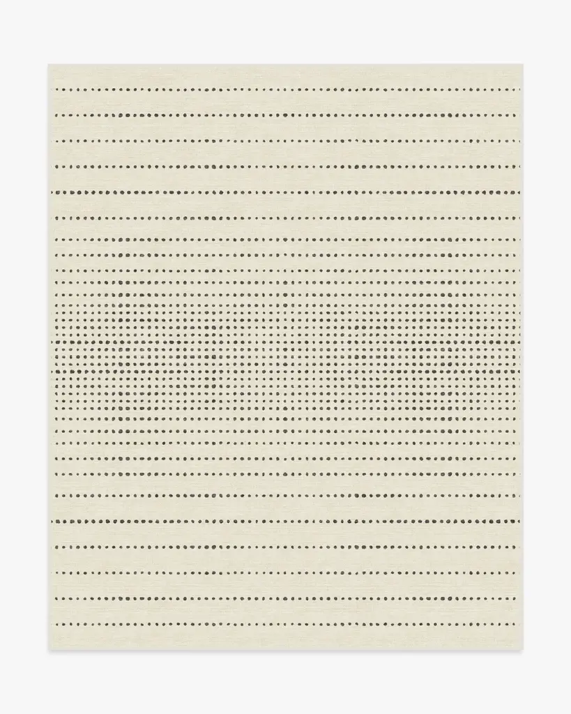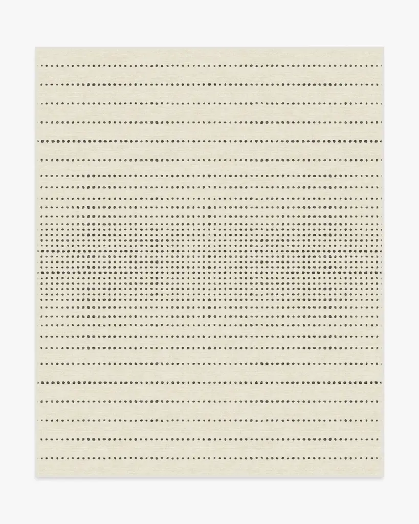 Give your favorite room an upgrade with our Array Black & Ivory Rug. This modern and clean design showcases high-contrast charcoal black stripes and repeating dotted lines against an ivory background, creating a unique play on perspective. Water-resistant, stain-resistant, and machine-washable. Rug colors may vary slightly according to your device and the lighting in your space.