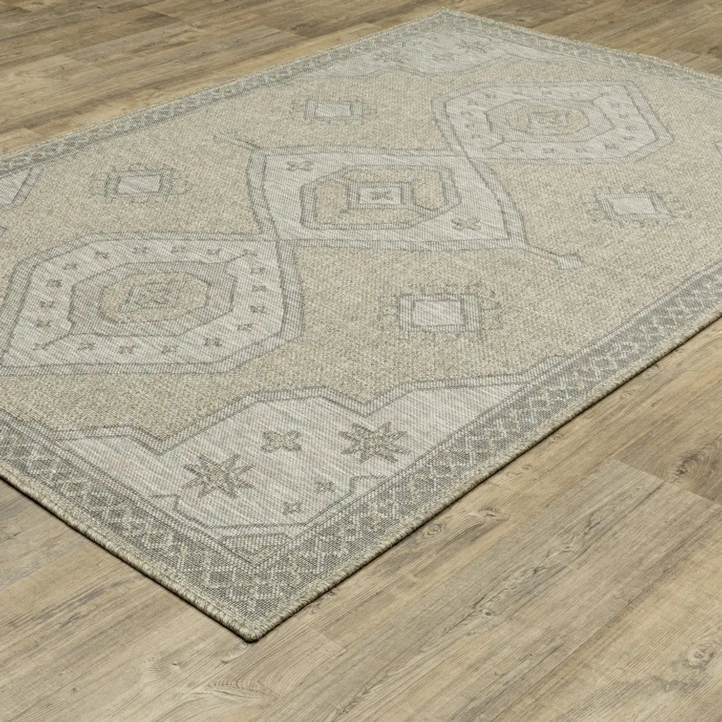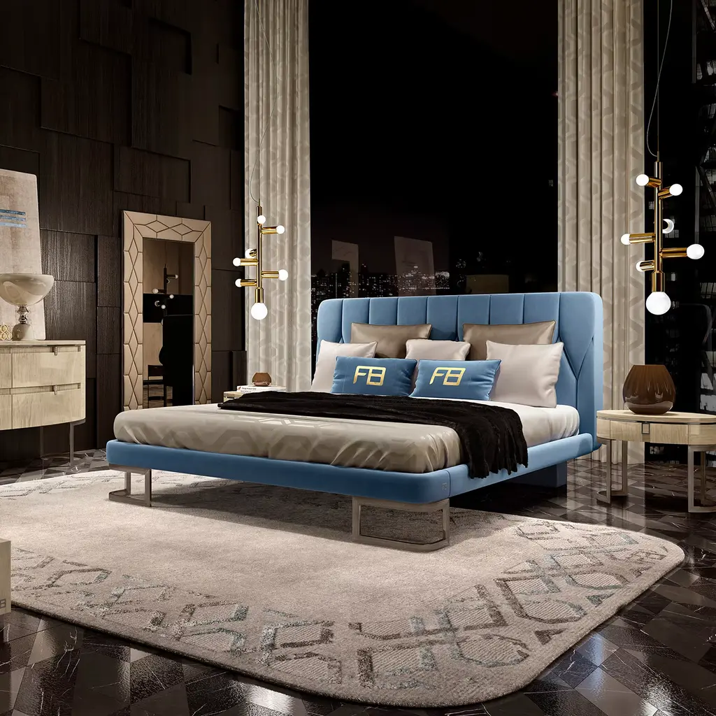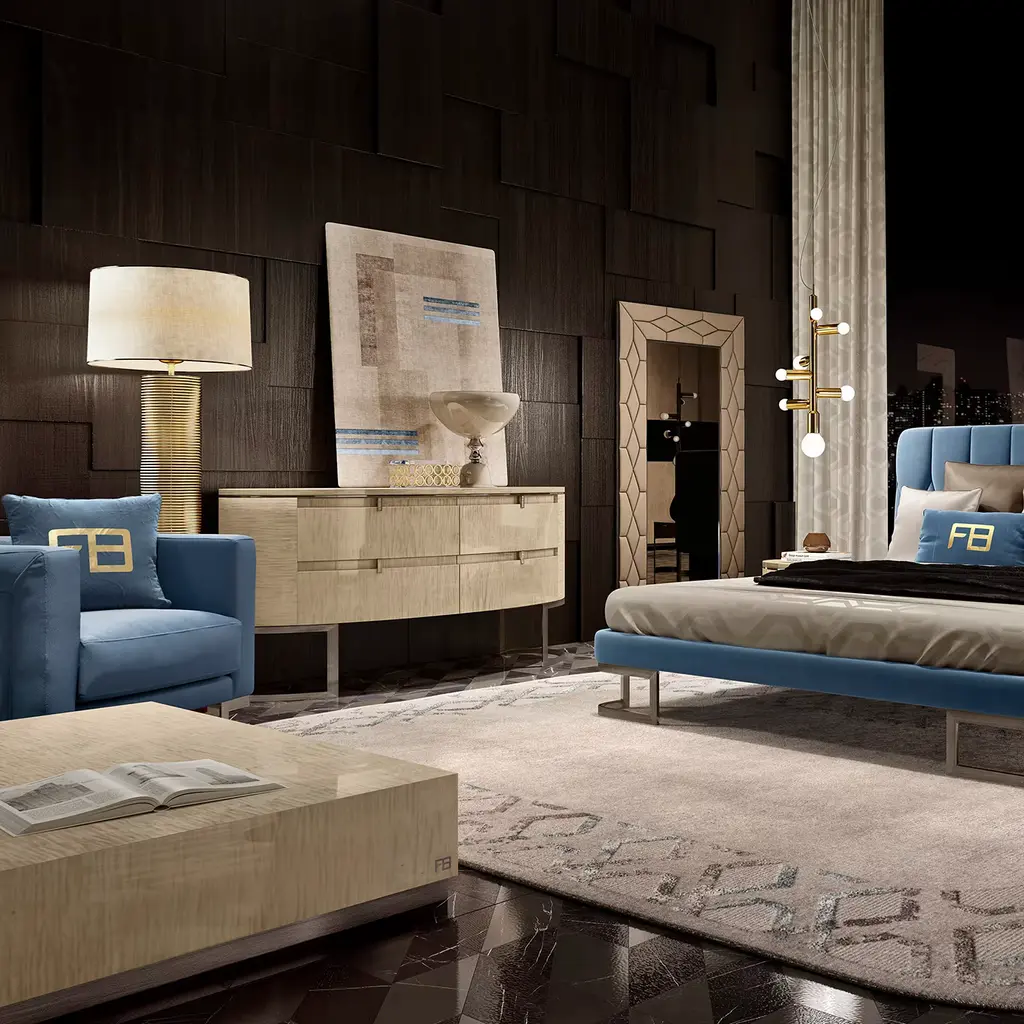 The medium-sized rug, hand-tufted in India by master weavers, blends New Zealand wool and viscose for a soft, luxurious feel. Its 1930s Art Deco-inspired design features interlocking geometric motifs in beige, gray, and light blue tones. The rug's rounded corners and subtle Franco Bianchini logo on the border enhance its refined elegance, making it a timeless addition to both classic and modern interiors.