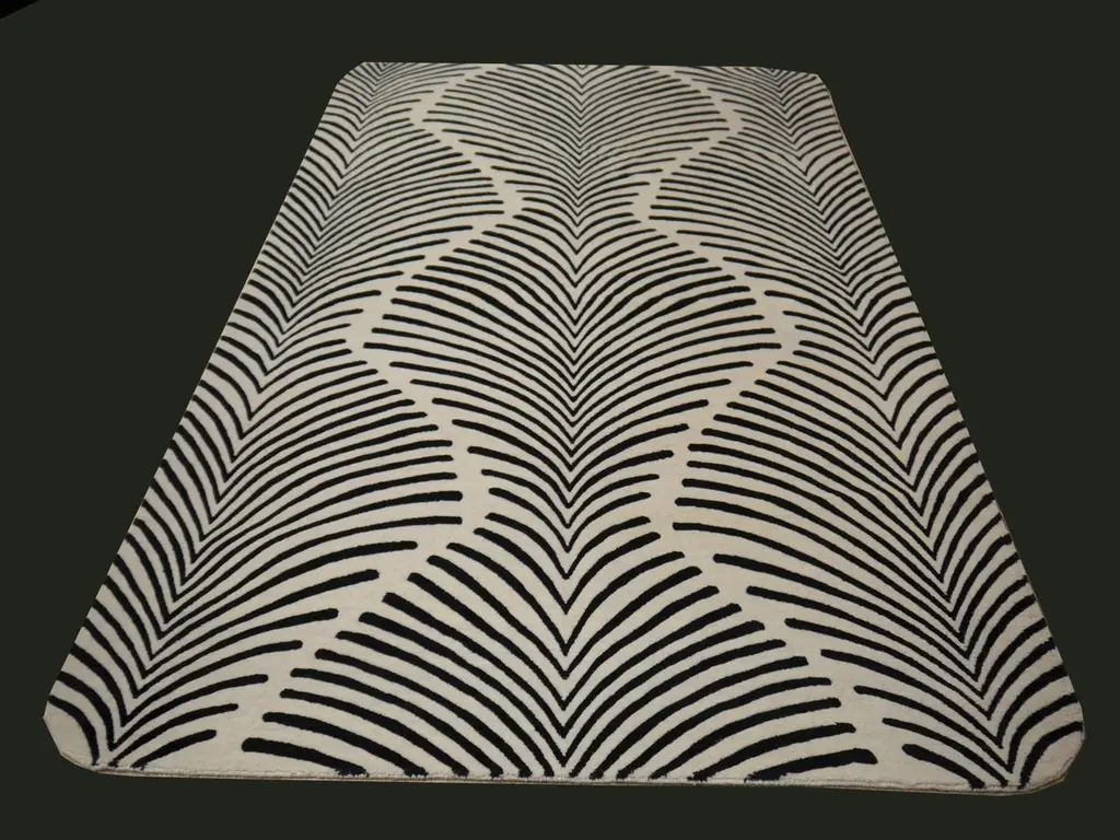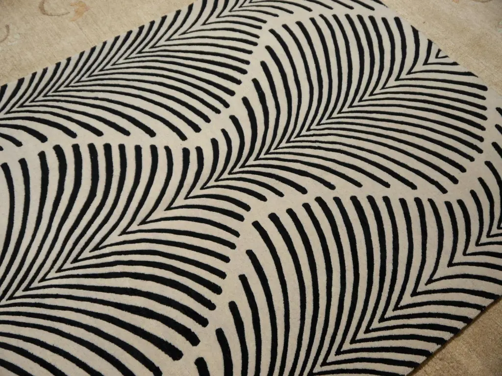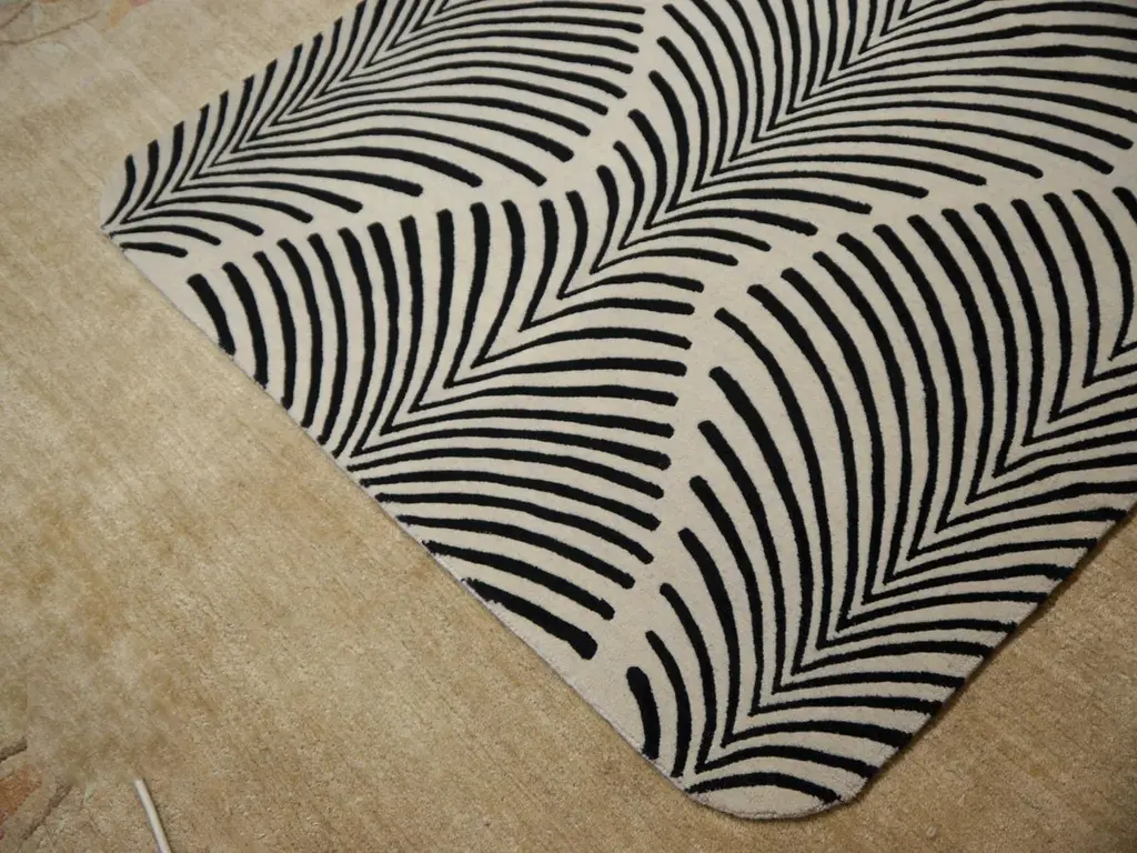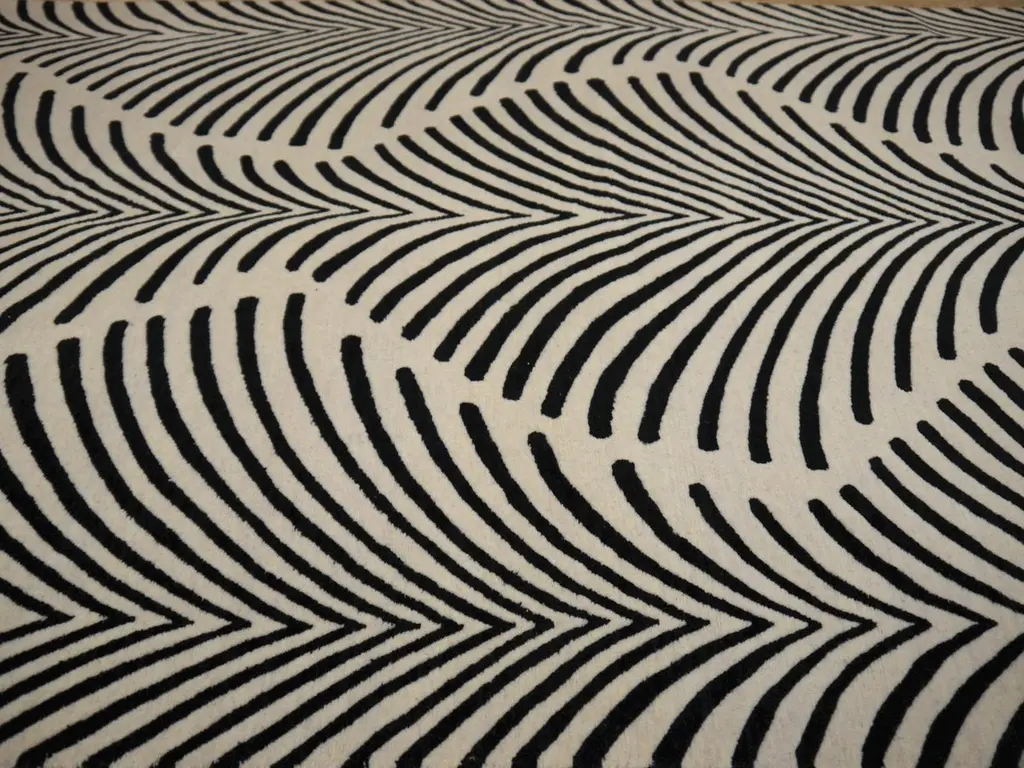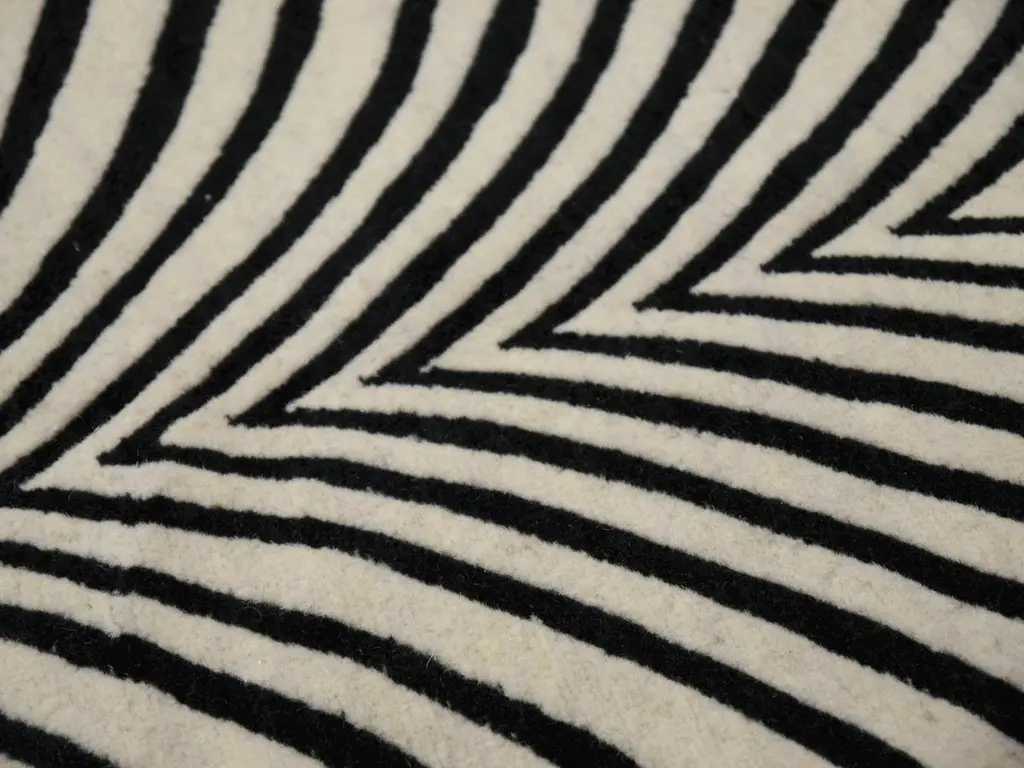 An Art Deco Zebra design rug, contemporary production, in style of antique Chinese rugs, hand knotted, using finest Tibetan highland wool.Very fine wool and quality. Current production, other sizes can be made on order.A real eye catcher. The zebra pattern on this rug is based on a design from the 1920s. In the Art Deco era, "animal" patterns were very popular. At various auction houses, including Sotheby's London and Lyon & Turnbull Glasgow, the designs for these pieces from the 1920s were assigned to the English architect Oliver Hill (1887 - 1968), who is said to have had such carpets made in Tiensin in North China for Nichols of London. Unfortunately we cannot find any evidence of this. We produce these carpets as a new edition in the classic size of 200 x 120 cm / 7 x 4 ft. Other formats are also possible on request. Design: Zebra Art Deco Size: 200 x 120 cm / 7 x 4 ft Materials: Tibetan highland wool Production method: hand-knotted Quality: Very fine 150 knots in Tibetan knots. The knot density refers to one square inch, this corresponds to 2.54 x 2.54 cm. With a fineness of 150 knots per square inch, the knot density corresponds to 232500 knots per square meter. The conversion factor from inch² to m² is x 1550. Colors: Ivory, black Age: New condition: unused other sizes possible: Yes, on order. Care: normal vacuum cleaner, if necessary professional carpet washing, no dry cleaning. Carpet stop underlay.