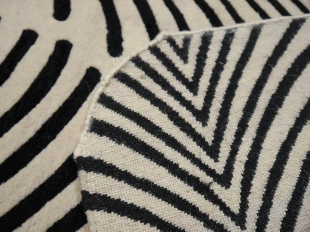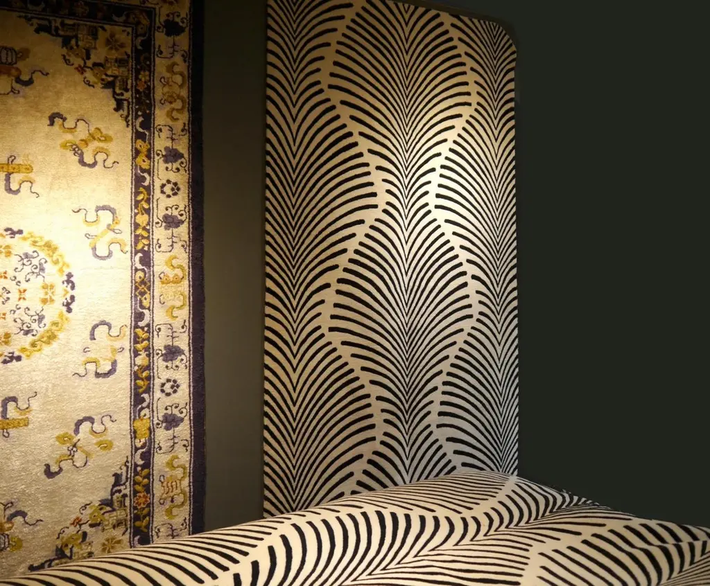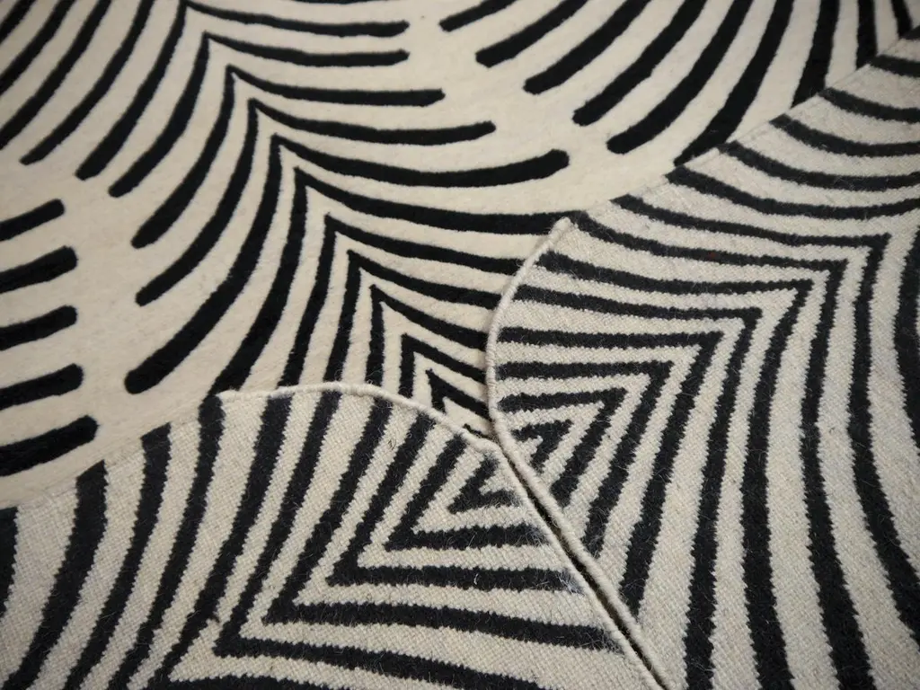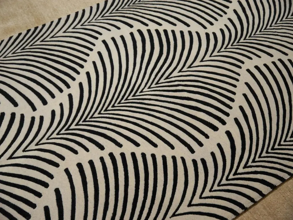 An Art Deco Zebra design rug, contemporary production, in style of antique Chinese rugs, hand knotted, using finest Tibetan highland wool.Very fine wool and quality. Current production, other sizes can be made on order.A real eye catcher. The zebra pattern on this rug is based on a design from the 1920s. In the Art Deco era, "animal" patterns were very popular. At various auction houses, including Sotheby's London and Lyon & Turnbull Glasgow, the designs for these pieces from the 1920s were assigned to the English architect Oliver Hill (1887 - 1968), who is said to have had such carpets made in Tiensin in North China for Nichols of London. Unfortunately we cannot find any evidence of this. We produce these carpets as a new edition in the classic size of 200 x 120 cm / 7 x 4 ft. Other formats are also possible on request. Design: Zebra Art Deco Size: 200 x 120 cm / 7 x 4 ft Materials: Tibetan highland wool Production method: hand-knotted Quality: Very fine 150 knots in Tibetan knots. The knot density refers to one square inch, this corresponds to 2.54 x 2.54 cm. With a fineness of 150 knots per square inch, the knot density corresponds to 232500 knots per square meter. The conversion factor from inch² to m² is x 1550. Colors: Ivory, black Age: New condition: unused other sizes possible: Yes, on order. Care: normal vacuum cleaner, if necessary professional carpet washing, no dry cleaning. Carpet stop underlay.