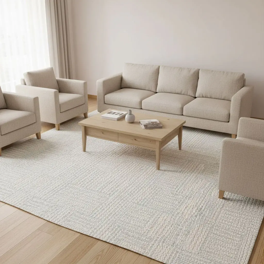 The Artic Custom Carpet offers a tailored flooring solution designed for various interior spaces. This custom-sized carpet is constructed from a durable blend of 50% wool and 50% polyester. This material composition combines the natural resilience and softness of wool with the enhanced durability and ease of maintenance provided by polyester fibers, resulting in a robust and long-lasting product. Manufactured in India, the carpet features a subtle, woven geometric pattern that adds texture and visual interest without dominating a room’s existing decor. Its edges are neatly bound for a clean, finished appearance. Available in a comprehensive range of custom dimensions, the Artic Custom Carpet can be precisely sized to fit specific requirements, from a compact 2 feet by 5 feet to an expansive 13 feet by 30 feet. This customization ensures an exact fit for unique room layouts or particular areas. While identified as "Multicolor," the product image prominently displays a neutral, light-toned option, typically appearing as an off-white or very light gray. This versatile palette allows the carpet to integrate seamlessly into a wide array of design aesthetics, from modern and minimalist to more transitional environments. The textured surface enhances its aesthetic appeal and practical functionality. This wool-polyester blend custom carpet is suitable for diverse applications, including high-traffic areas such as living rooms, dining rooms, bedrooms, and select commercial settings. Its material blend provides comfort underfoot while maintaining its structure and appearance through daily use.