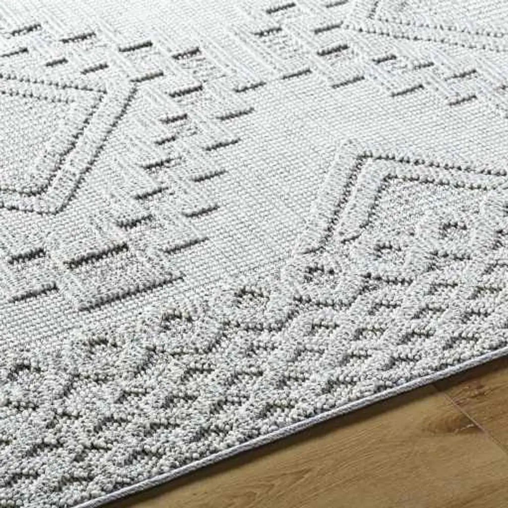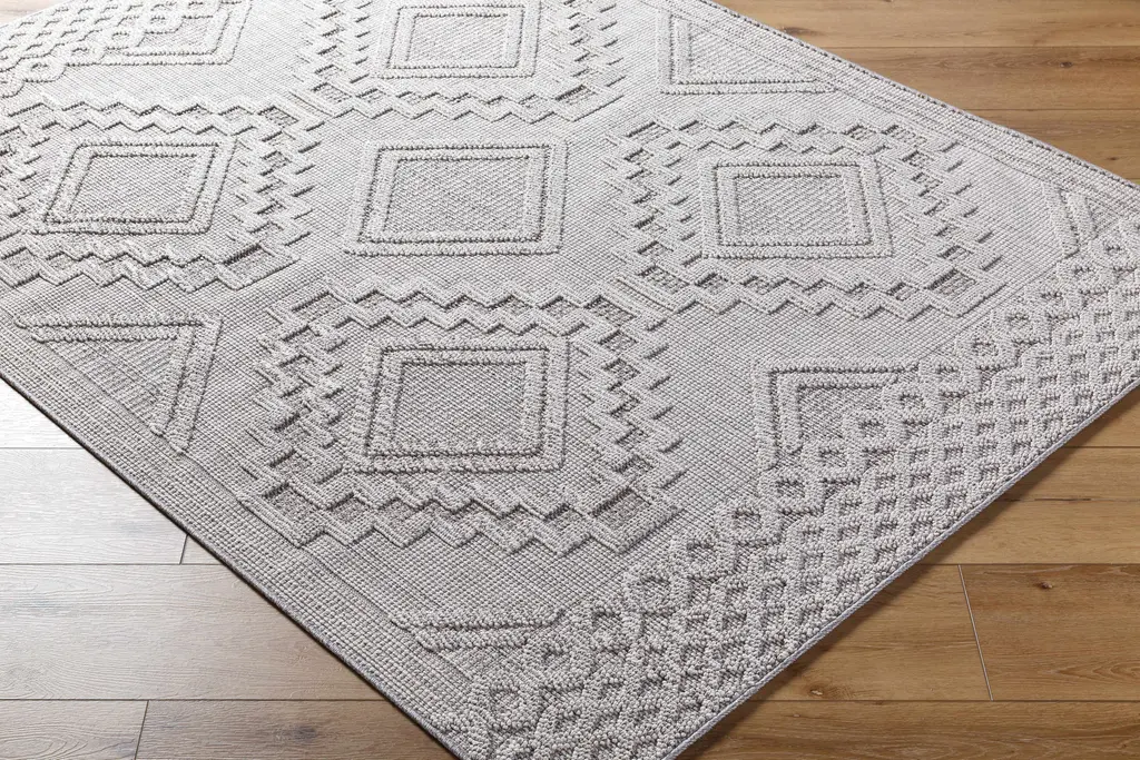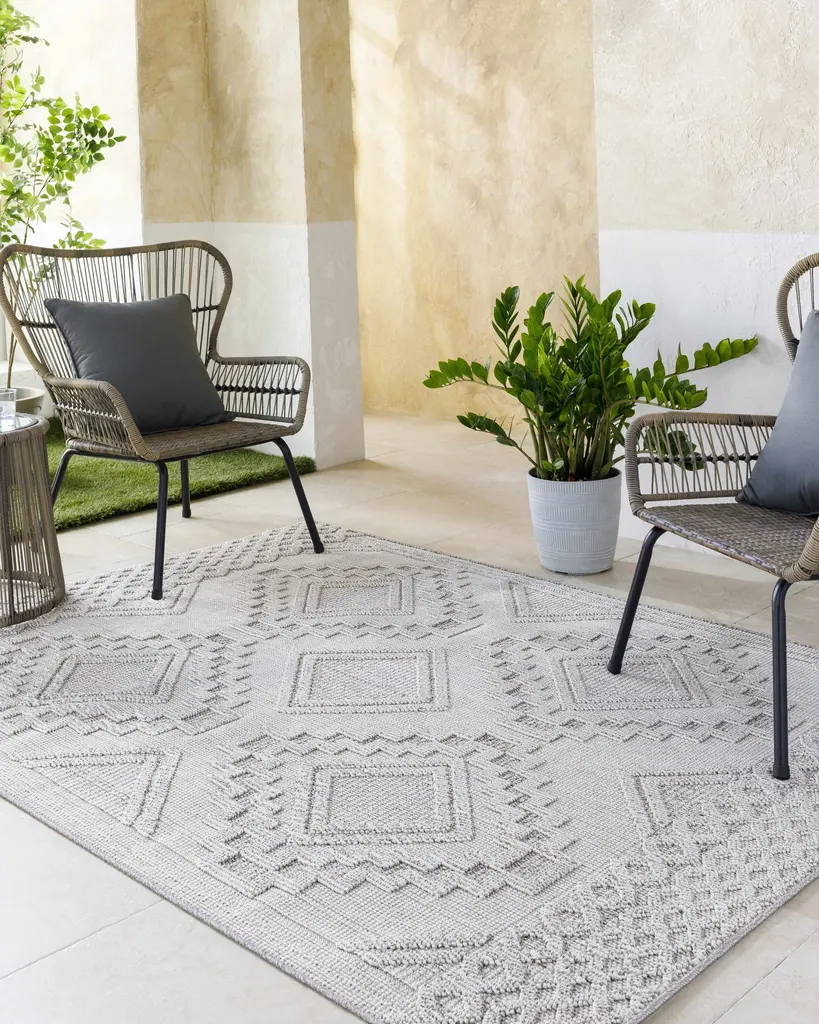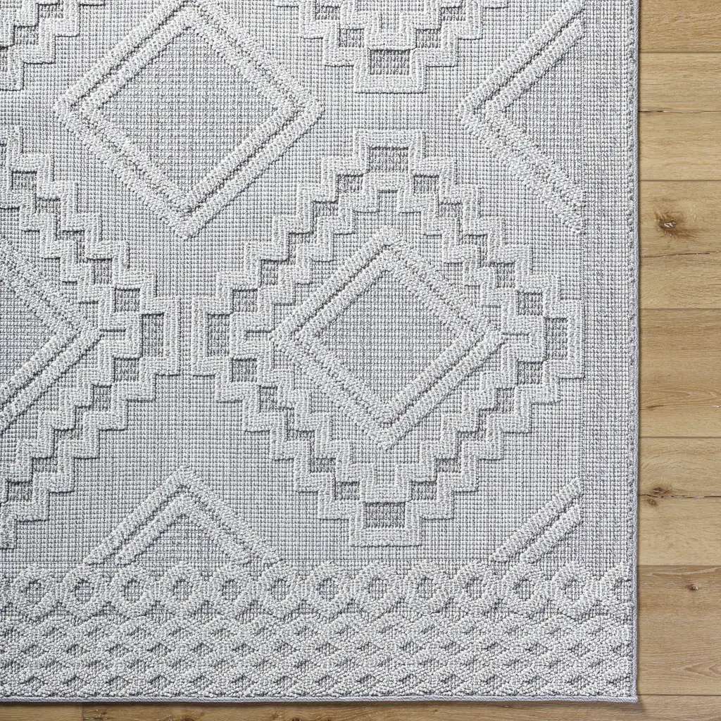 Collection: Arwid Colors: Gray, LightGray Construction: Machine Woven Material: 100% Polypropylene Pile: Medium Pile Pile Height: 0.35" Styles: Contemporary Outdoor Safe: Yes Made In: Turkey Thickness: 0.39" Price Range: $$$$$ (Affordable)