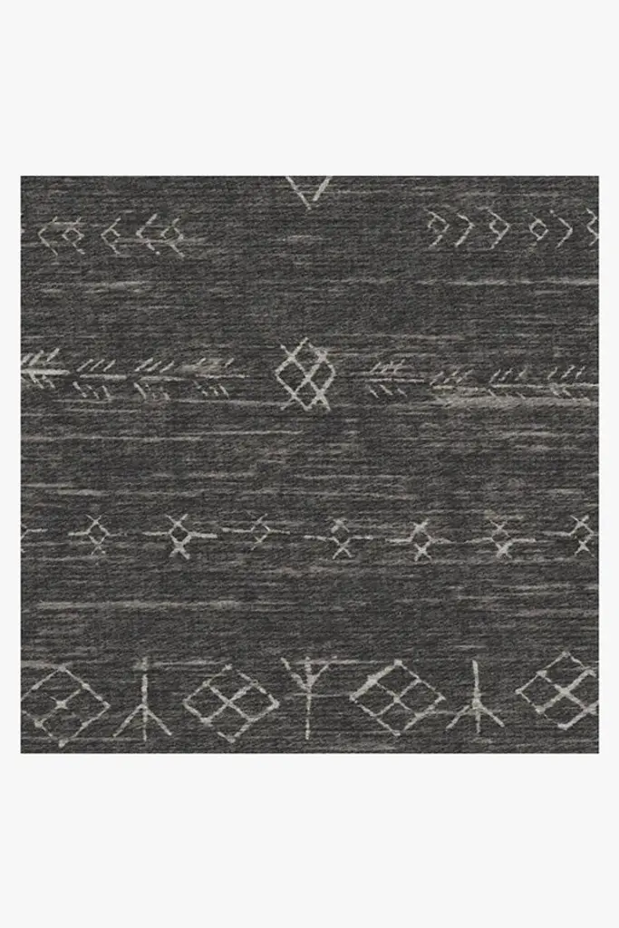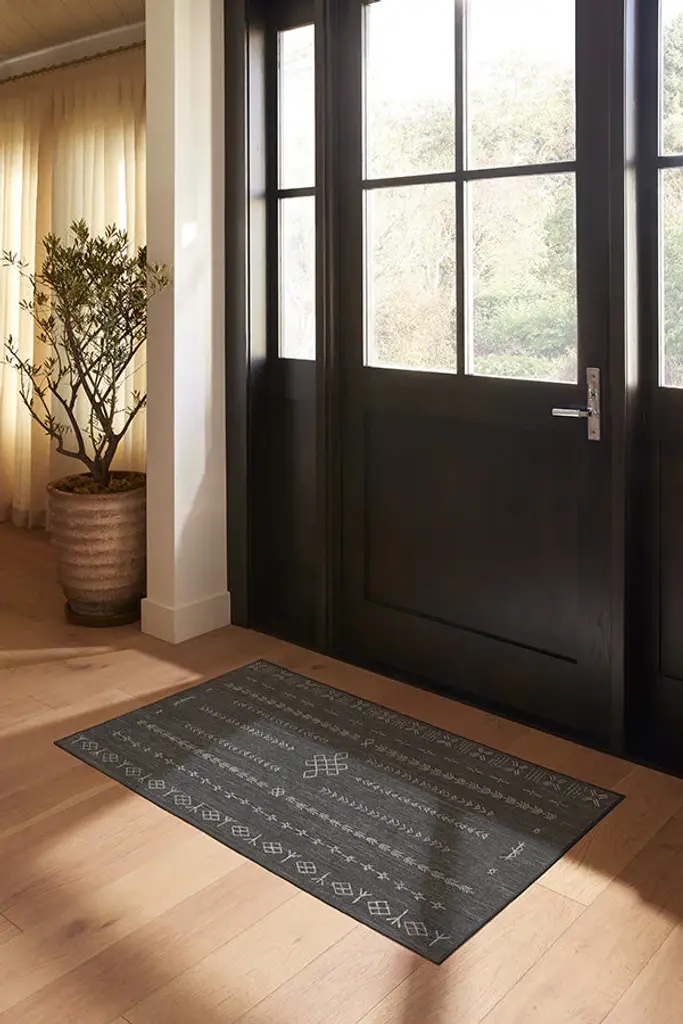 Create a modern oasis with our Astrid Soft Black Rug. Inspired by shapes reminiscent of the ancient Norse alphabet and knots found on Viking ships, this intricate design blends soft grey and white motifs against a black background. Water-resistant, stain-resistant, and machine-washable. Rug colors may vary slightly according to your device and the lighting in your space.