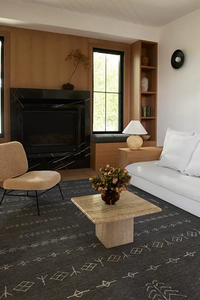 Create a modern oasis with our Astrid Soft Black Rug. Inspired by shapes reminiscent of the ancient Norse alphabet and knots found on Viking ships, this intricate design blends soft grey and white motifs against a black background. Water-resistant, stain-resistant, and machine-washable. Rug colors may vary slightly according to your device and the lighting in your space.