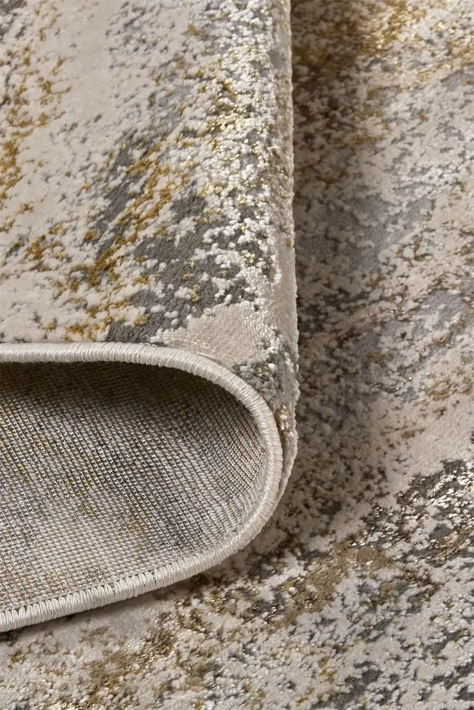 Collection: Aura Colors: Gold, Gray, Ivory Construction: Machine Made Material: Face: Polyester, Polypropylene / Warp: Jute Pile: Low Pile Pile Height: 0.39" Styles: Contemporary,Industrial Backing: Jute Made In: Turkey Thickness: 0.39" Price Range: $$$$$ (Affordable)