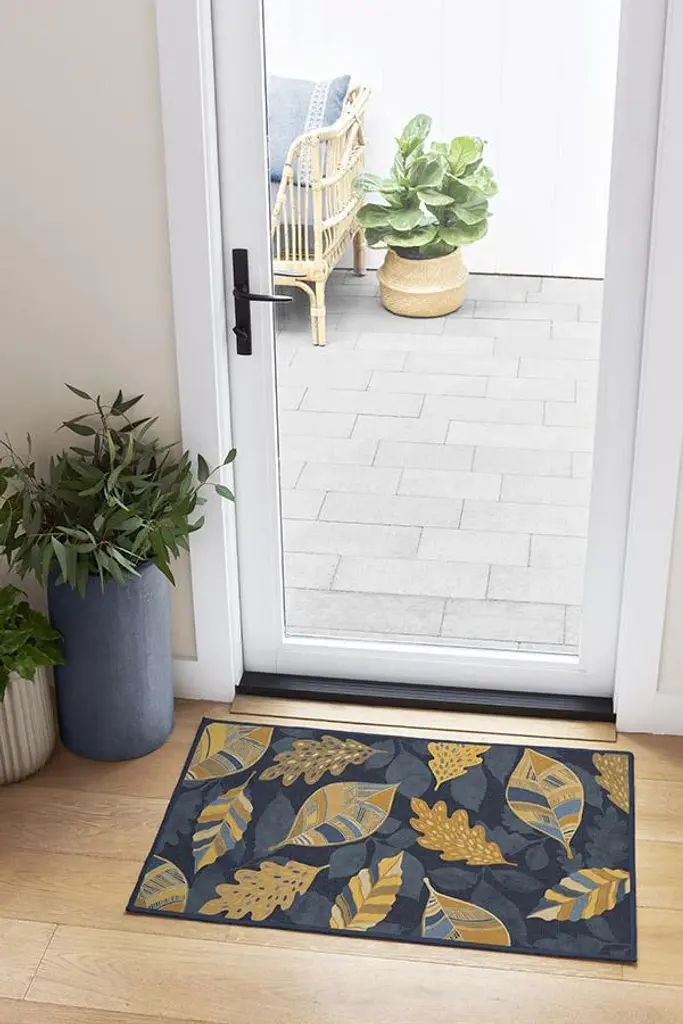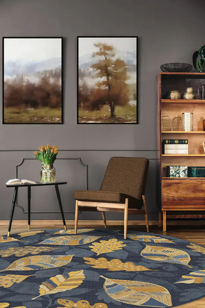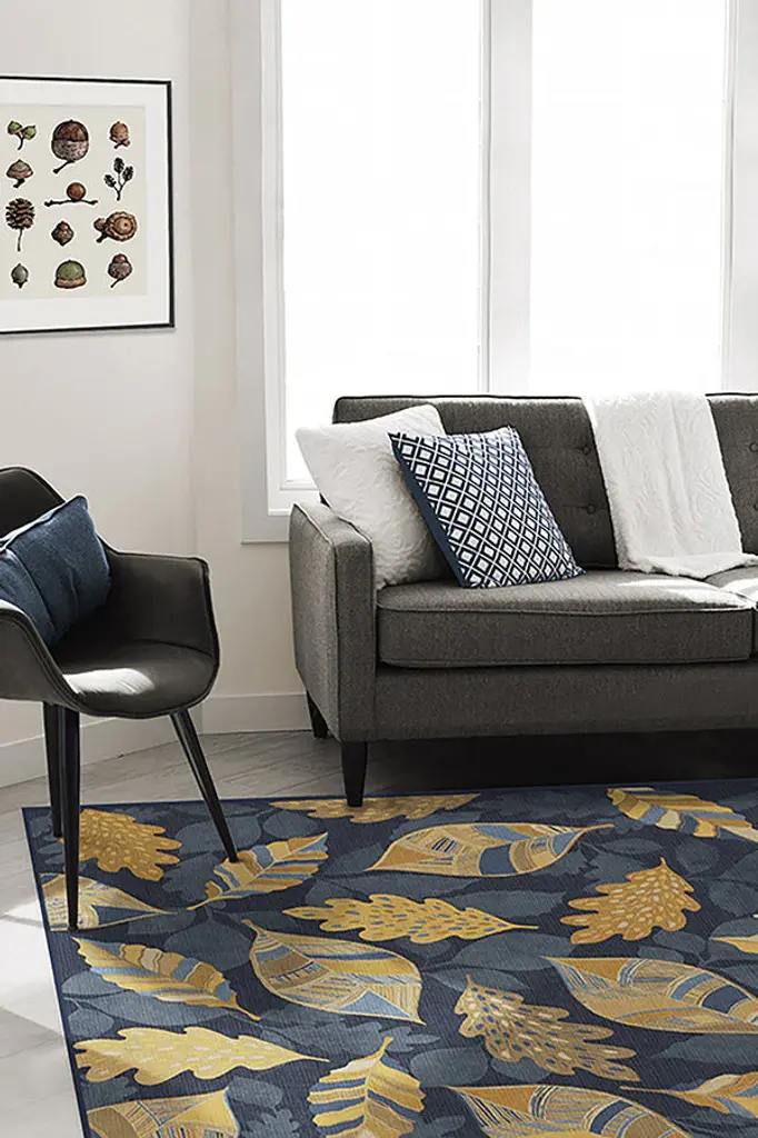 Our Aurelia Navy Gold Rug captures the gorgeous scene of falling autumn leaves. This blue and gold area rug features a modernized take on a classic motif with a twist of bright yellow hues and golden beige on a background of dark blue. This play of color, coupled with varied leaf patterns, gives off a vibe that is both warm and festive.