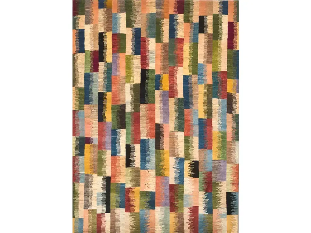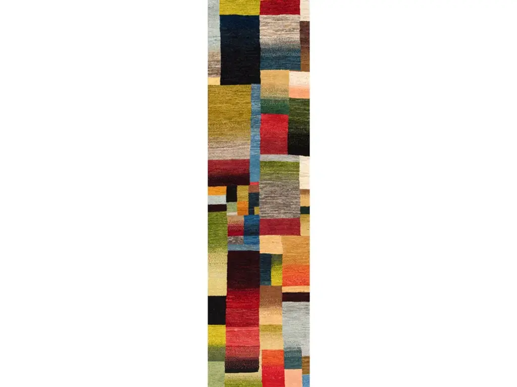 Aureole 2 is a rectangular wool rug.Zollanvari Fine Gabbehs.The inspiration for this design emanated from triple-medallion Ghashgha’i Gabbehs. Here, the three-medallion and simple all-round border design have been ‘glitched’. The colours are traditional Gabbeh colours accentuated with a contemporary on-trend touch. The upshot is a Gabbeh for the 21st century, that has the mystical aura of traditional gabbehs and exudes light.The inspiration for this latest collection is an ingenious fusion of traditional Gabbeh iconography and Glitch art – a visual style characterised by using digital or analogue errors for aesthetic purposes, whether that be intentional (that is, “faking glitch” and obtaining a similar aesthetic through design) or by accident (a true manifestation inside of the system without human intervention). The term “glitch” itself originates with engineers and astronauts to explain faults within the technology they were working with. But the visual aesthetic can be traced much further back, to the beginning of the 20th century through distorted forms in cubist paintings, abstract short films and pixel-like rug designs akin to 8-bit video game landscapes. In fact, many antique rugs feature abstract, distorted patterns that seem to predict the glitch movement of later centuries. This new collection, including its marketing and sales, will set off a new Gabbeh revolution. The designs are available in custom and bespoke sizes and colours.