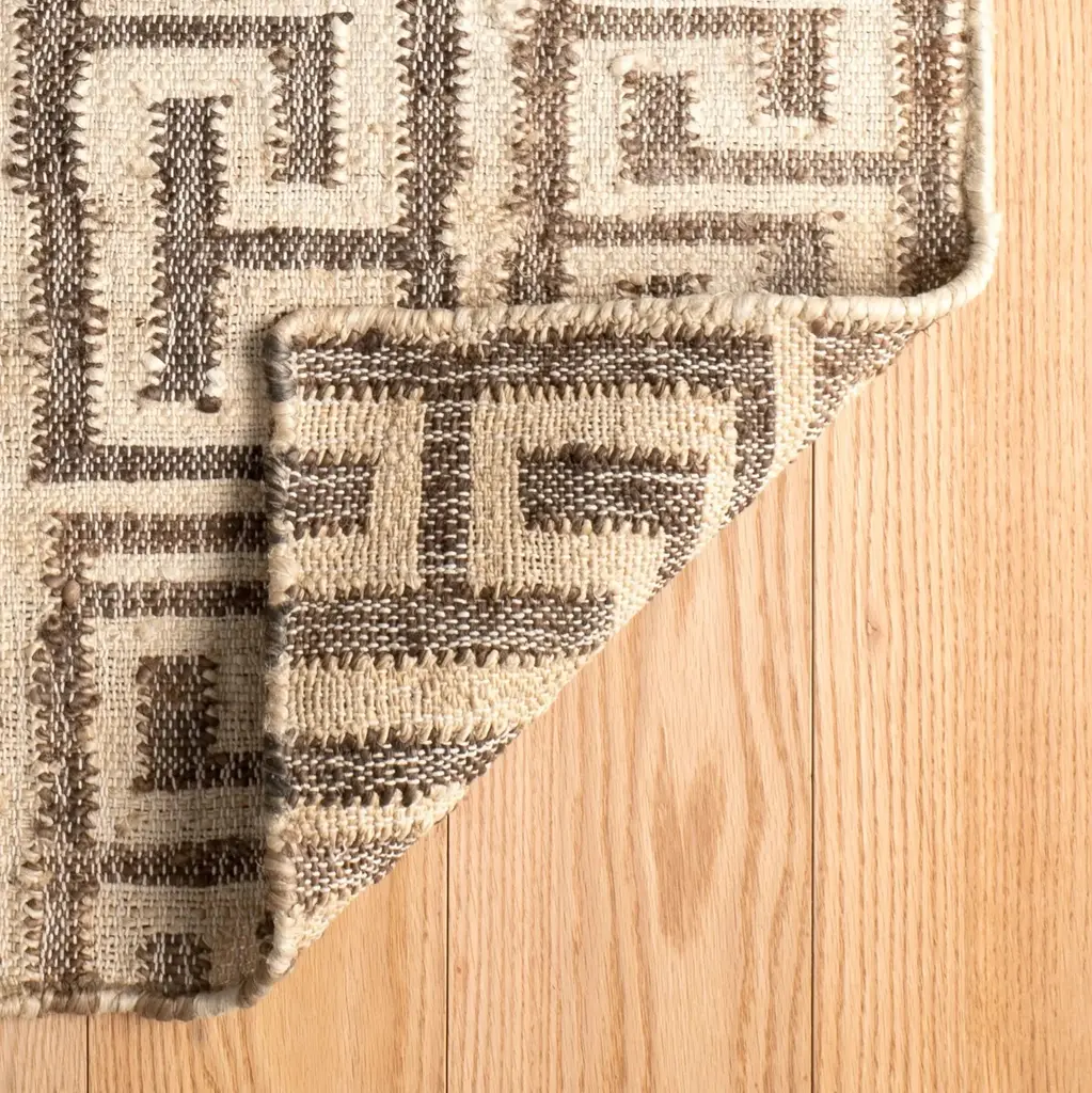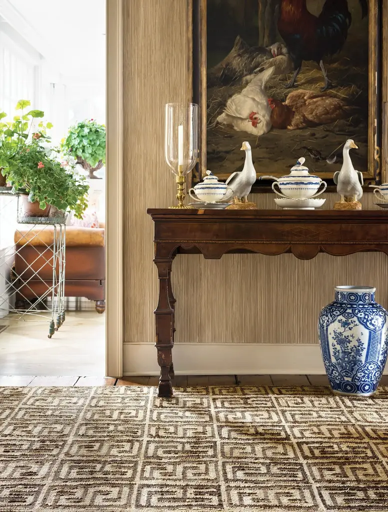 In her latest capsule collection, Annie's friend and collaborator Bunny Williams was inspired by the unique geometric Kuba weaving of central Africa. The sacred Kuba designs are mathematical and rhythmic in vegetable-dyed earth tones and evolved from a number of techniques featuring flat weaving and cut pile, with patchwork, embroidery, and applique. The Auricula dhurrie weave rug has a natural jute greek key-like motif woven onto alternating rectangles of brown and natural. Translated with hard working jute fiber, this modern and timeless rug is sophisticated and practical, especially for high traffic areas.