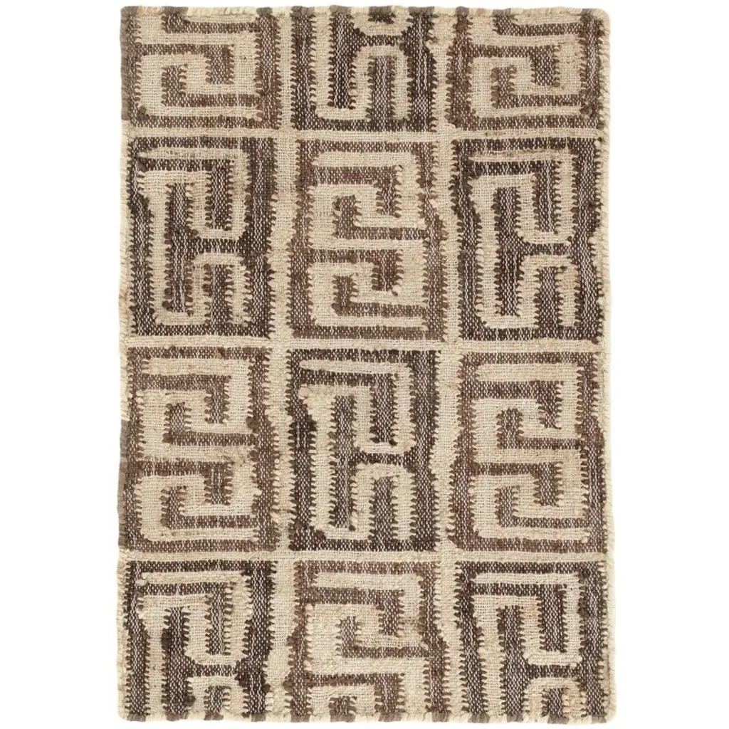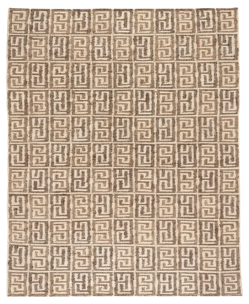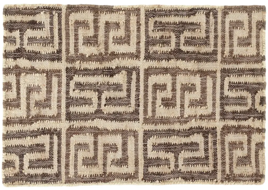In her latest capsule collection, Annie's friend and collaborator Bunny Williams was inspired by the unique geometric Kuba weaving of central Africa. The sacred Kuba designs are mathematical and rhythmic in vegetable-dyed earth tones and evolved from a number of techniques featuring flat weaving and cut pile, with patchwork, embroidery, and applique. The Auricula dhurrie weave rug has a natural jute greek key-like motif woven onto alternating rectangles of brown and natural. Translated with hard working jute fiber, this modern and timeless rug is sophisticated and practical, especially for high traffic areas.