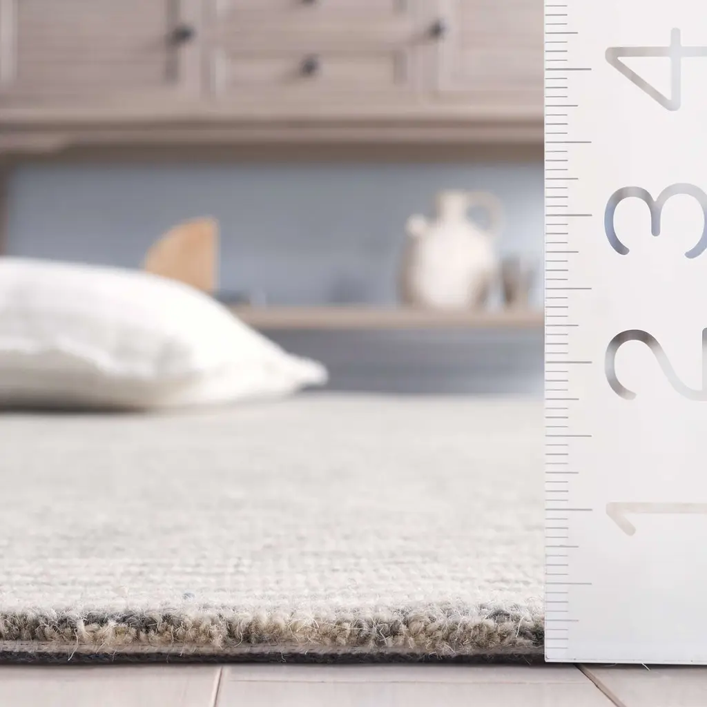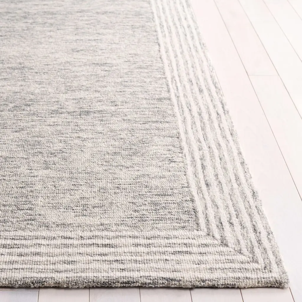 Elevate your living space with the timeless elegance of our hand-tufted wool-cotton blend area rug. Crafted in India, this 3' x 5' small rectangle rug boasts a height of 3/8" and is constructed from a luxurious blend of 85% wool and 15% cotton for a plush, soft touch underfoot. The sophisticated grey and ivory color palette ensures a perfect match for any room, adding a subtle touch of refinement without overpowering your decor. The rug's pattern features a serene, heathered grey field encased in a crisp ivory border with multiple lines, creating a simple yet compelling design that will draw the eye and complement a variety of interior styles. Designed for durability and comfort, this elegant rug is an excellent choice for areas with high foot traffic, providing a cozy foundation for your home. The hand-tufted construction not only reflects superior craftsmanship but also offers a dense pile that is comfortable to walk on, making it an ideal addition to your living room, bedroom, or study. Add an element of understated luxury to your home with this exquisite area rug.