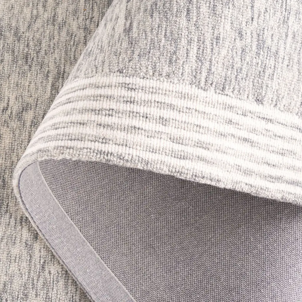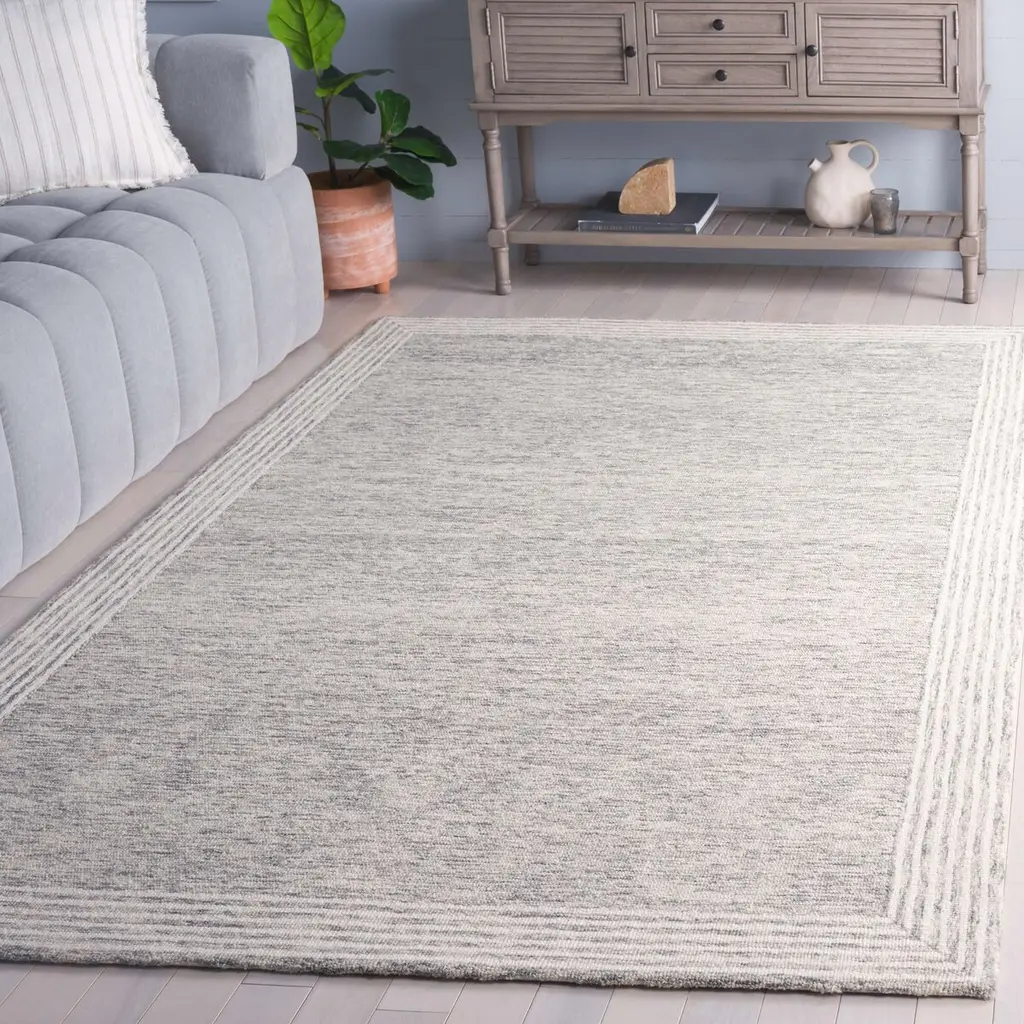 Elevate your living space with the timeless elegance of our hand-tufted wool-cotton blend area rug. Crafted in India, this 3' x 5' small rectangle rug boasts a height of 3/8" and is constructed from a luxurious blend of 85% wool and 15% cotton for a plush, soft touch underfoot. The sophisticated grey and ivory color palette ensures a perfect match for any room, adding a subtle touch of refinement without overpowering your decor. The rug's pattern features a serene, heathered grey field encased in a crisp ivory border with multiple lines, creating a simple yet compelling design that will draw the eye and complement a variety of interior styles. Designed for durability and comfort, this elegant rug is an excellent choice for areas with high foot traffic, providing a cozy foundation for your home. The hand-tufted construction not only reflects superior craftsmanship but also offers a dense pile that is comfortable to walk on, making it an ideal addition to your living room, bedroom, or study. Add an element of understated luxury to your home with this exquisite area rug.