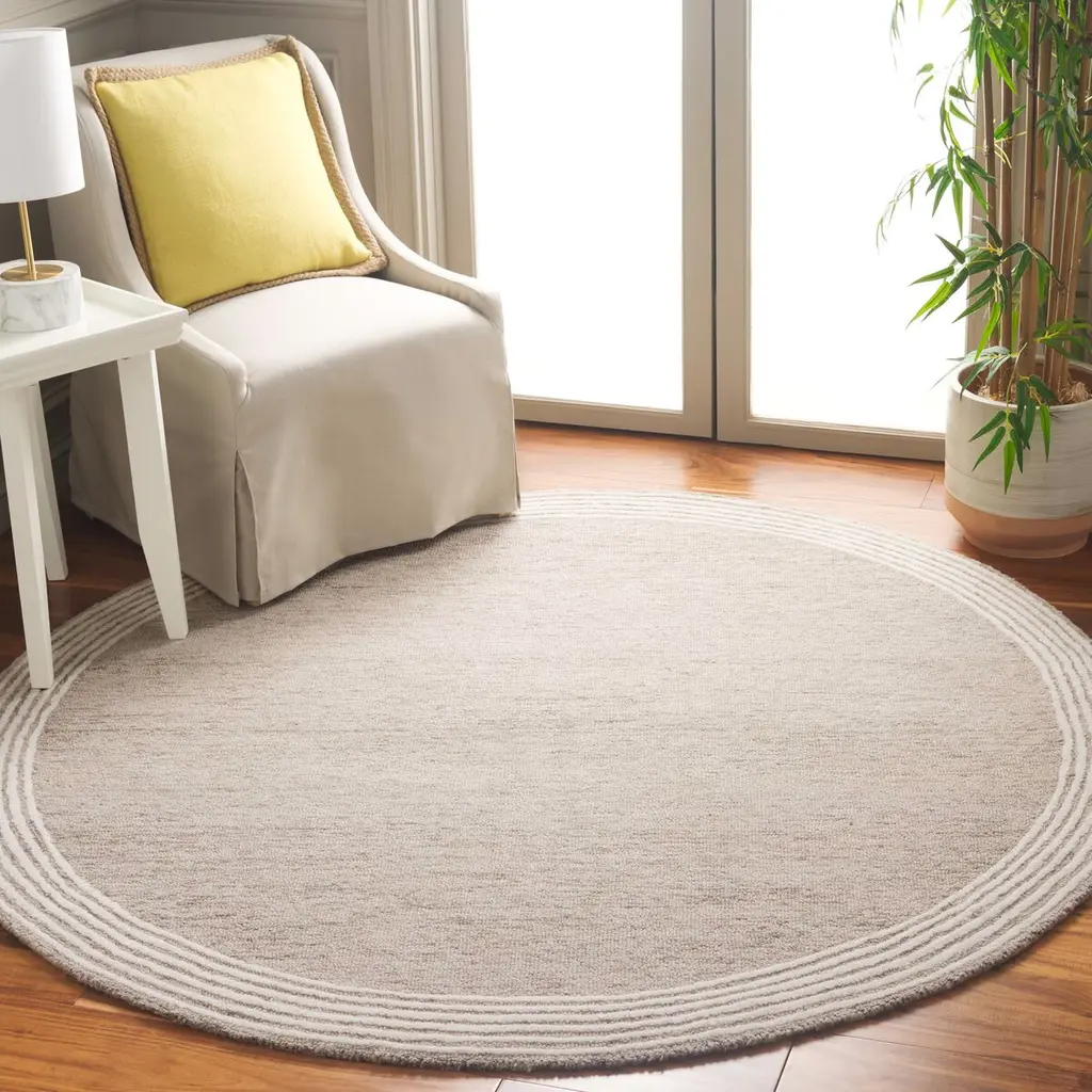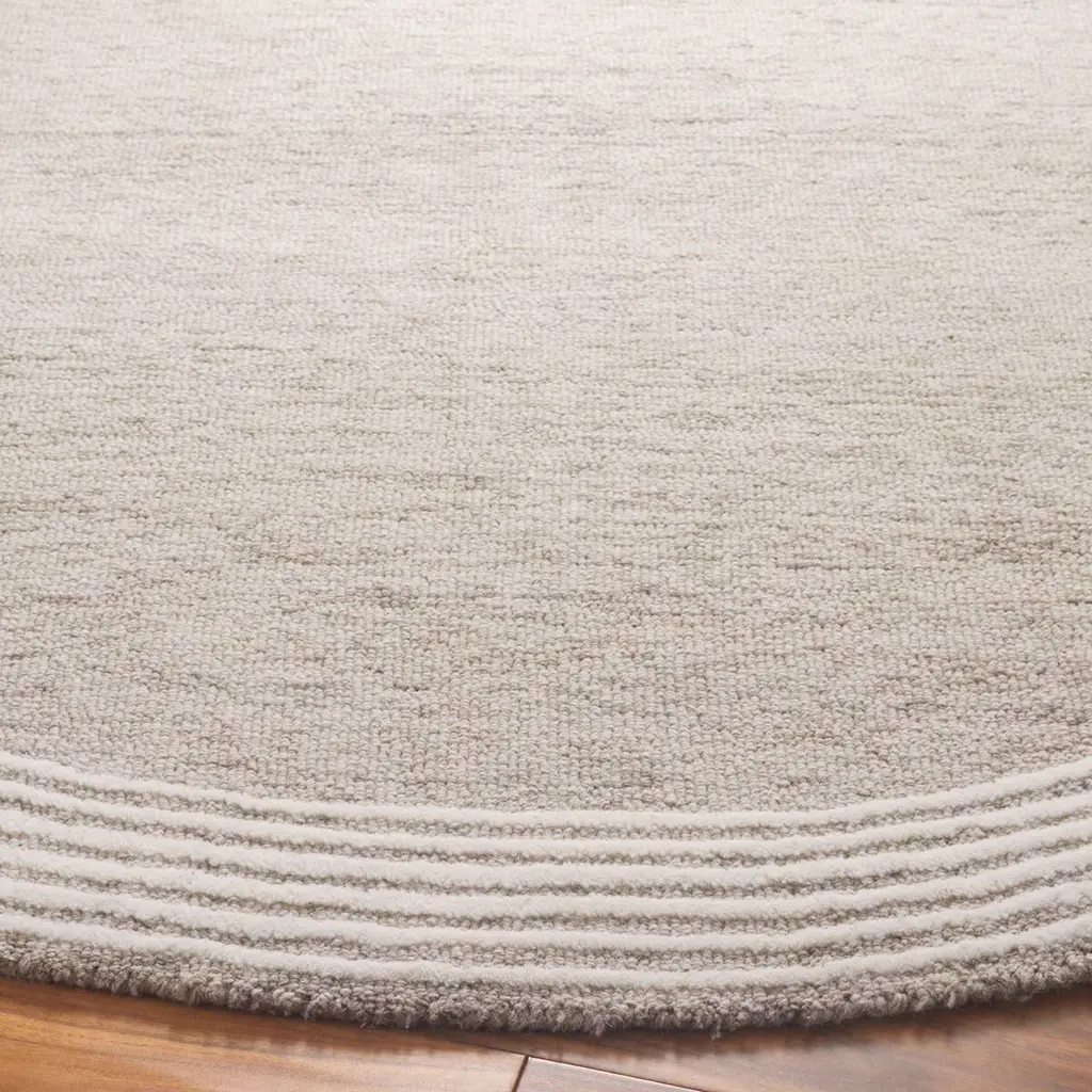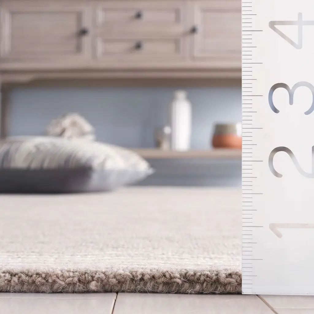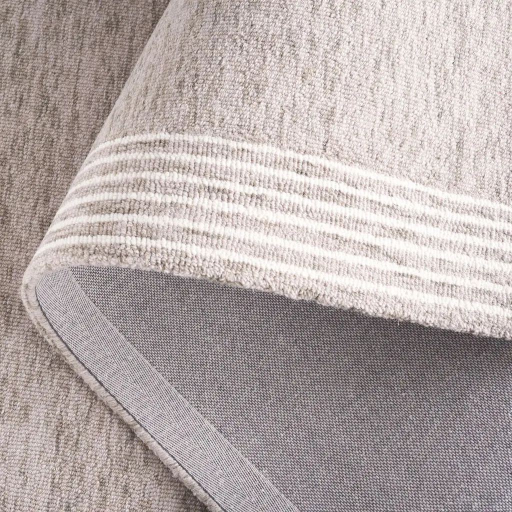Elevate your living space with the timeless elegance of our hand-tufted wool-cotton blend area rug. Crafted in India, this 3' x 5' small rectangle rug boasts a height of 3/8" and is constructed from a luxurious blend of 85% wool and 15% cotton for a plush, soft touch underfoot. The sophisticated grey and ivory color palette ensures a perfect match for any room, adding a subtle touch of refinement without overpowering your decor. The rug's pattern features a serene, heathered grey field encased in a crisp ivory border with multiple lines, creating a simple yet compelling design that will draw the eye and complement a variety of interior styles. Designed for durability and comfort, this elegant rug is an excellent choice for areas with high foot traffic, providing a cozy foundation for your home. The hand-tufted construction not only reflects superior craftsmanship but also offers a dense pile that is comfortable to walk on, making it an ideal addition to your living room, bedroom, or study. Add an element of understated luxury to your home with this exquisite area rug.