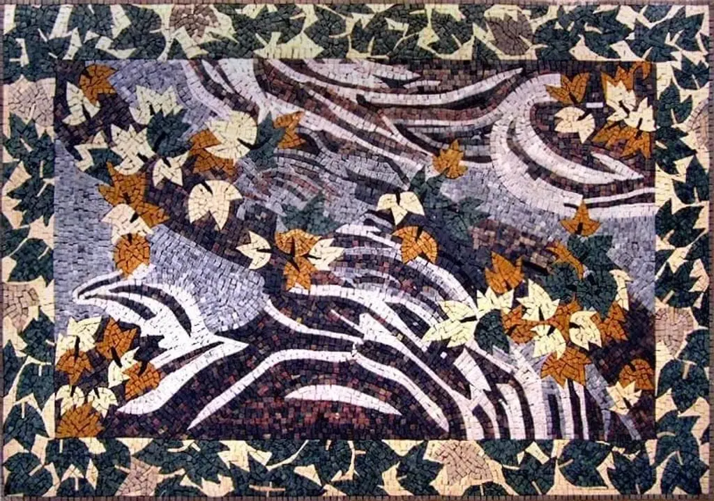 This is a floral handmade marble mosaic rug of autumn leaves. MF153 is composed of all natural stones and hand cut tiles and can be used as a floral decor on a wall mural or a marble floor. Sq.Ft. : 13.99Marble Count : 15000Backing: Your Mosaic comes on a mesh Backing Mosaic Uses: Floors, Walls both Indoor or Outdoor as well as wet placesTechnique: Handmade