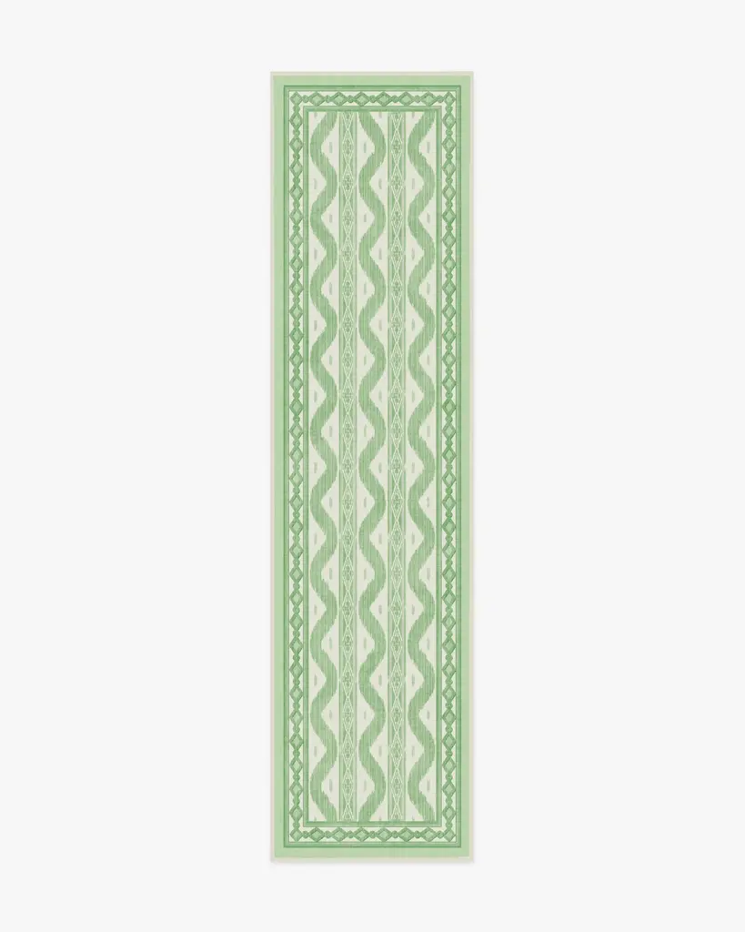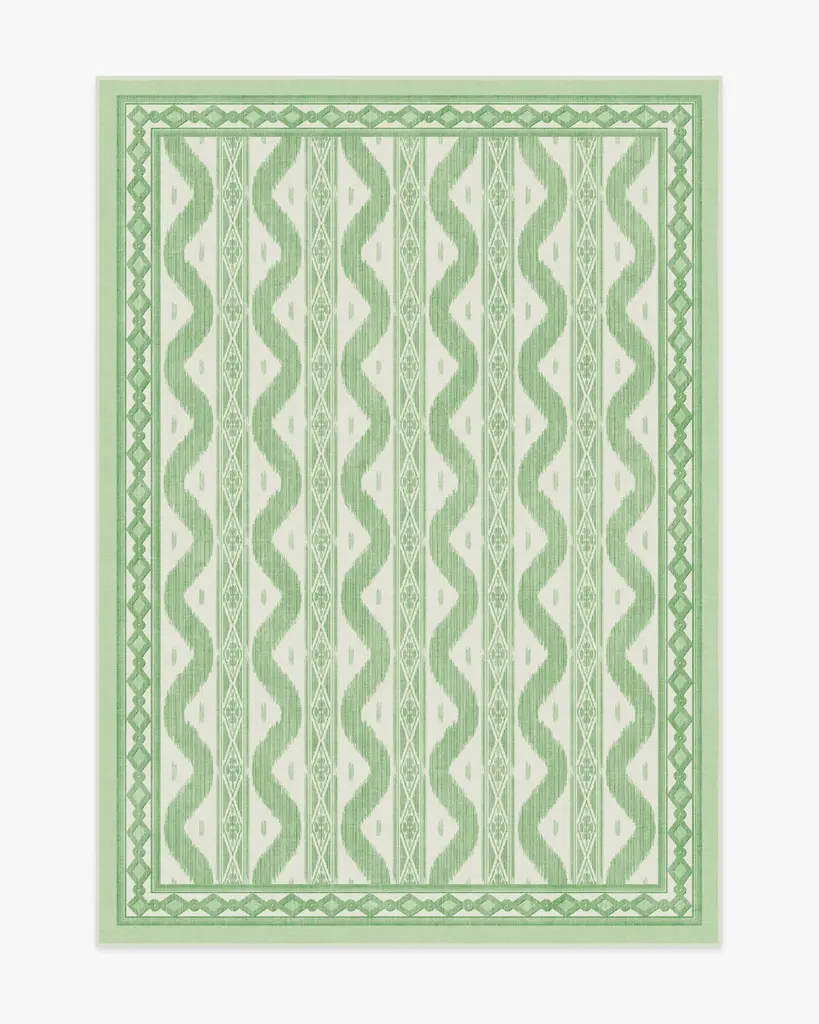 Modern elegance with a touch of fun, this design showcases Mrs. Alice’s signature Ikat patterns with a playful pop of green. Intricate patterning and a monochromatic palette of greens, from light to dark with subtle hints of yellowish-green, add depth and texture, all set against a neutral cream ground. Water-resistant, stain-resistant, and machine-washable. Rug colors may vary slightly according to your device and the lighting in your space.