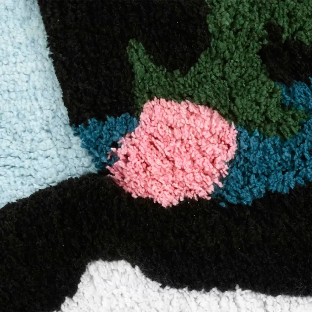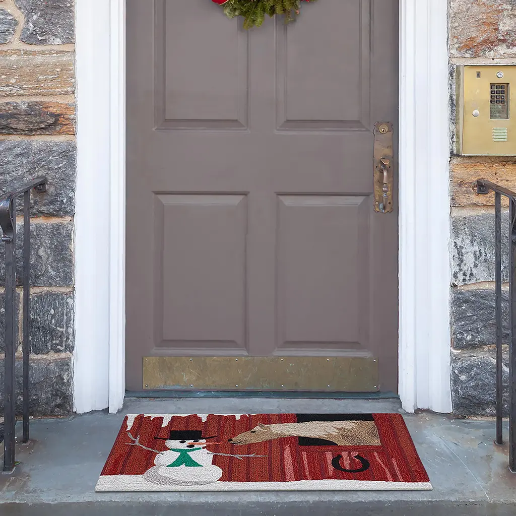 The Avanti Blue Snowman Decorative Holiday Bath Rug features a smiling snowman with eyes of coal, a carrot nose and a black top hat with holly accent. The background is light blue. Tufted of 100% cotton, 20" x 32" with latex non-skid back.