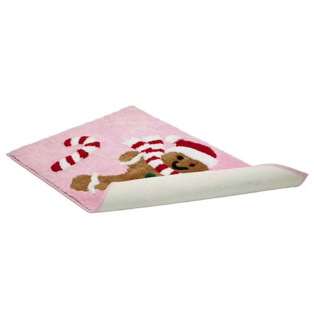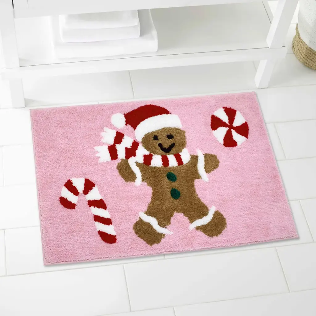 The Avanti Gingerbread Man Decorative Holiday Bath Rug features a happy gingerbread man with red and white scarf and hat. A candy cane and peppermint candy on a pink ground finish the design. Tufted of 100% polyester for easy care and brilliant colors. 20" x 32" with non-skid back.